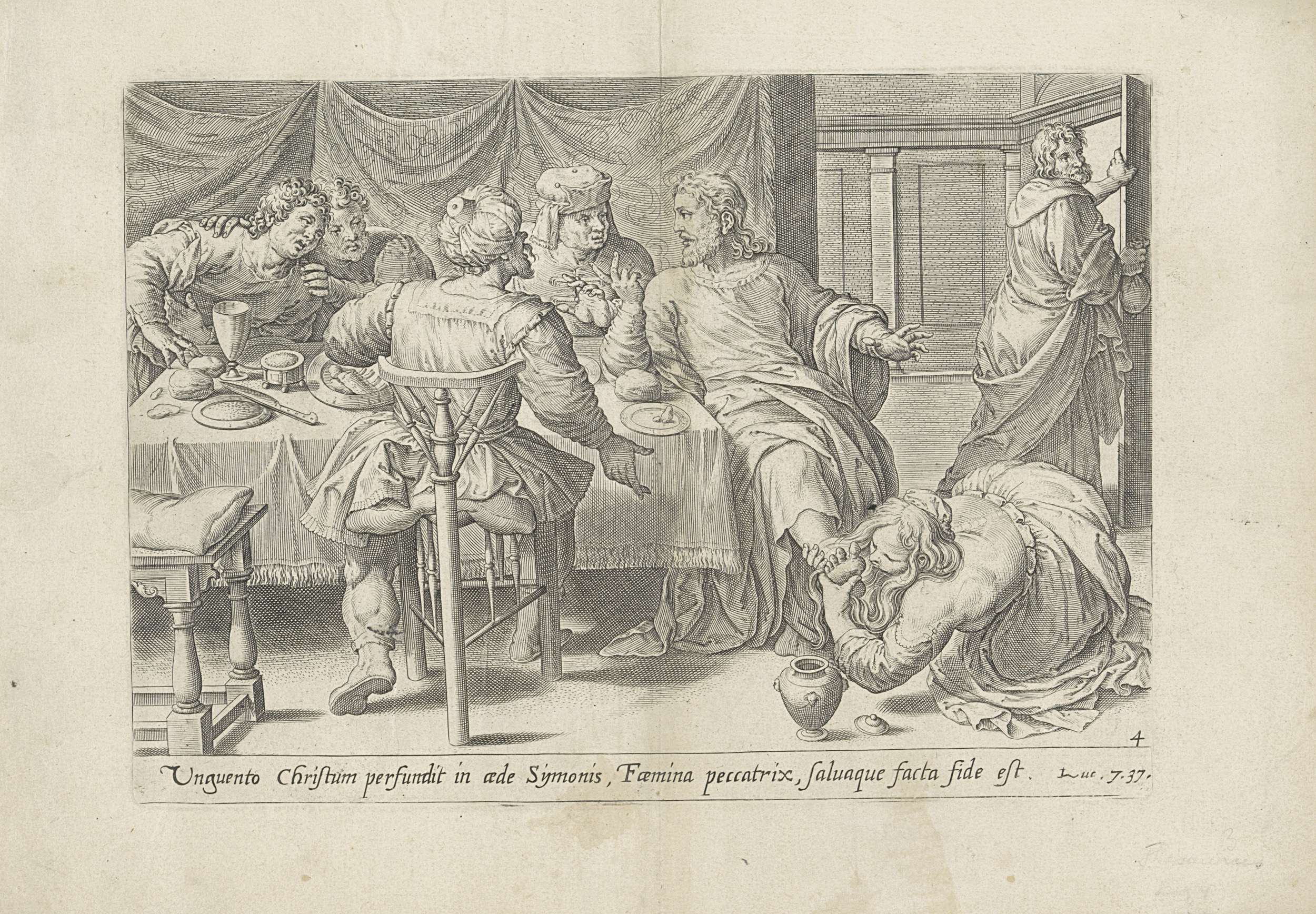 Christus is te gast voor de maaltijd in het huis van Simon de farizeeër. Een zondares zalft de voeten van Christus en droogt ze met haar haren. Naast haar staat de zalfpot. Christus is in gesprek met Simon. Onder de voorstelling een verwijzing in het Latijn naar de Bijbeltekst in Luc. 7:37.