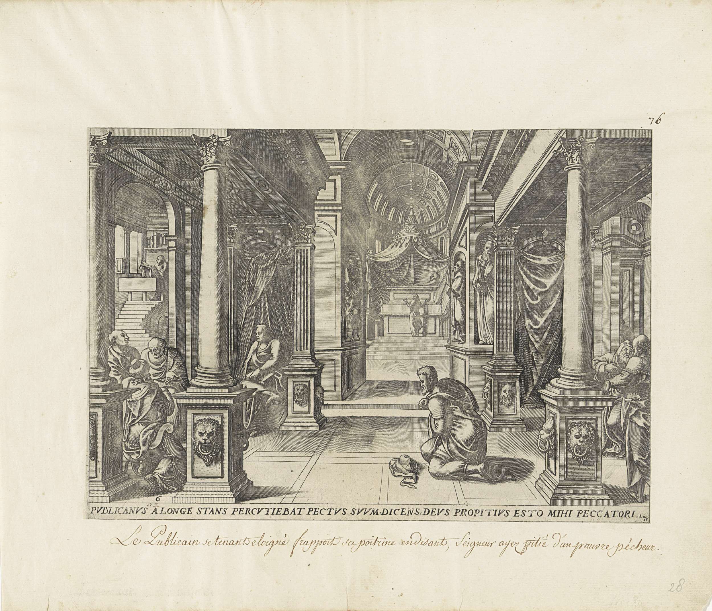 De tollenaar knielt berouwvol op de voorgrond in de tempel en vraagt God om genade. Bij het altaar op de achtergrond bidt de farizeeër, die God dankt dat hij niet is zoals de tollenaar. Onder de voorstelling een verwijzing in het Latijn naar de Bijbeltekst in Luc. 18.