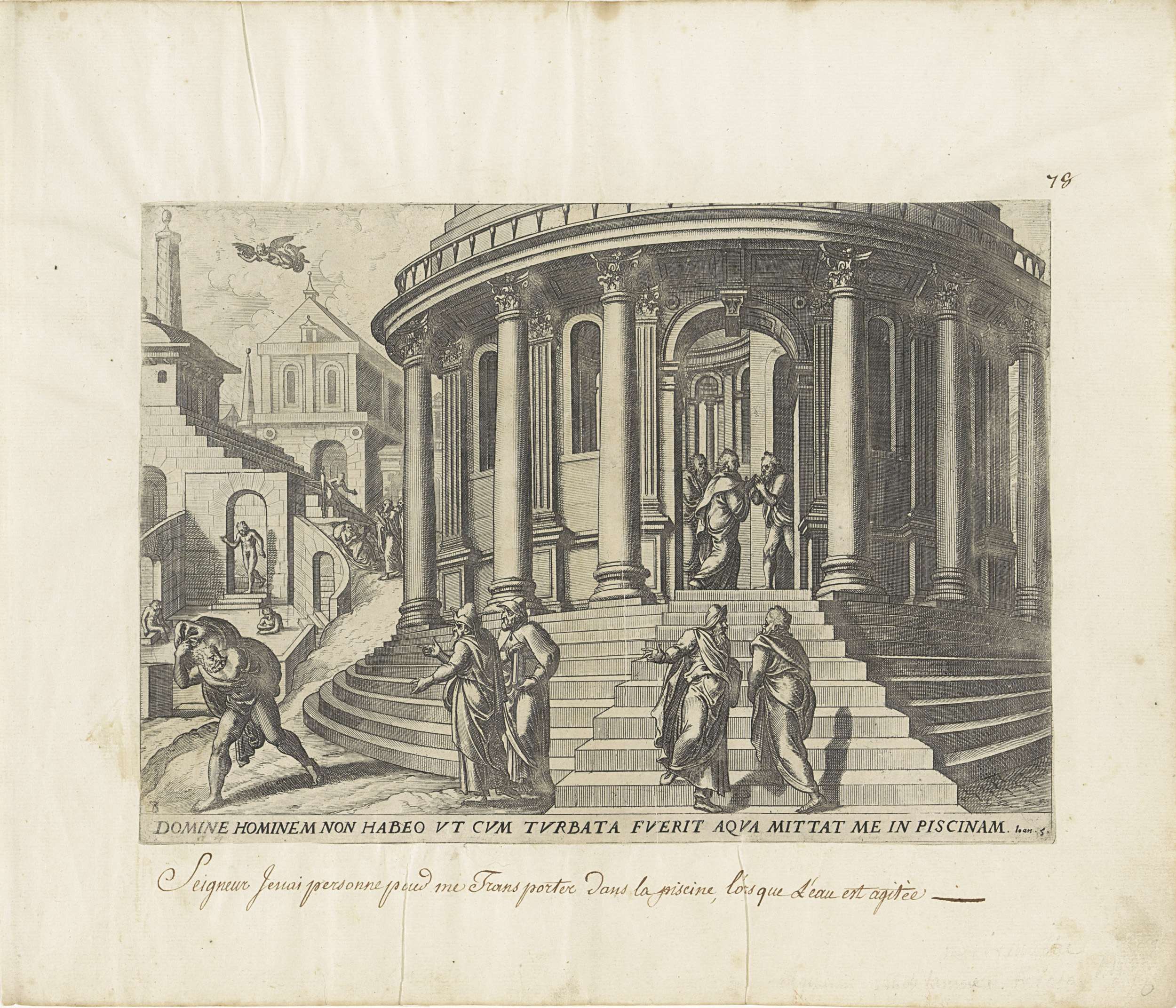 Links op de achtergrond wachten zieken bij het bad van Betzata tot een engel komt om het water in beweging te brengen. Een man die al achtendertig jaar ziek is en niemand heeft om hem naar het water te dragen ligt rechts van het bad en wordt door Christus genezen. Christus geeft hem de opdracht ...
