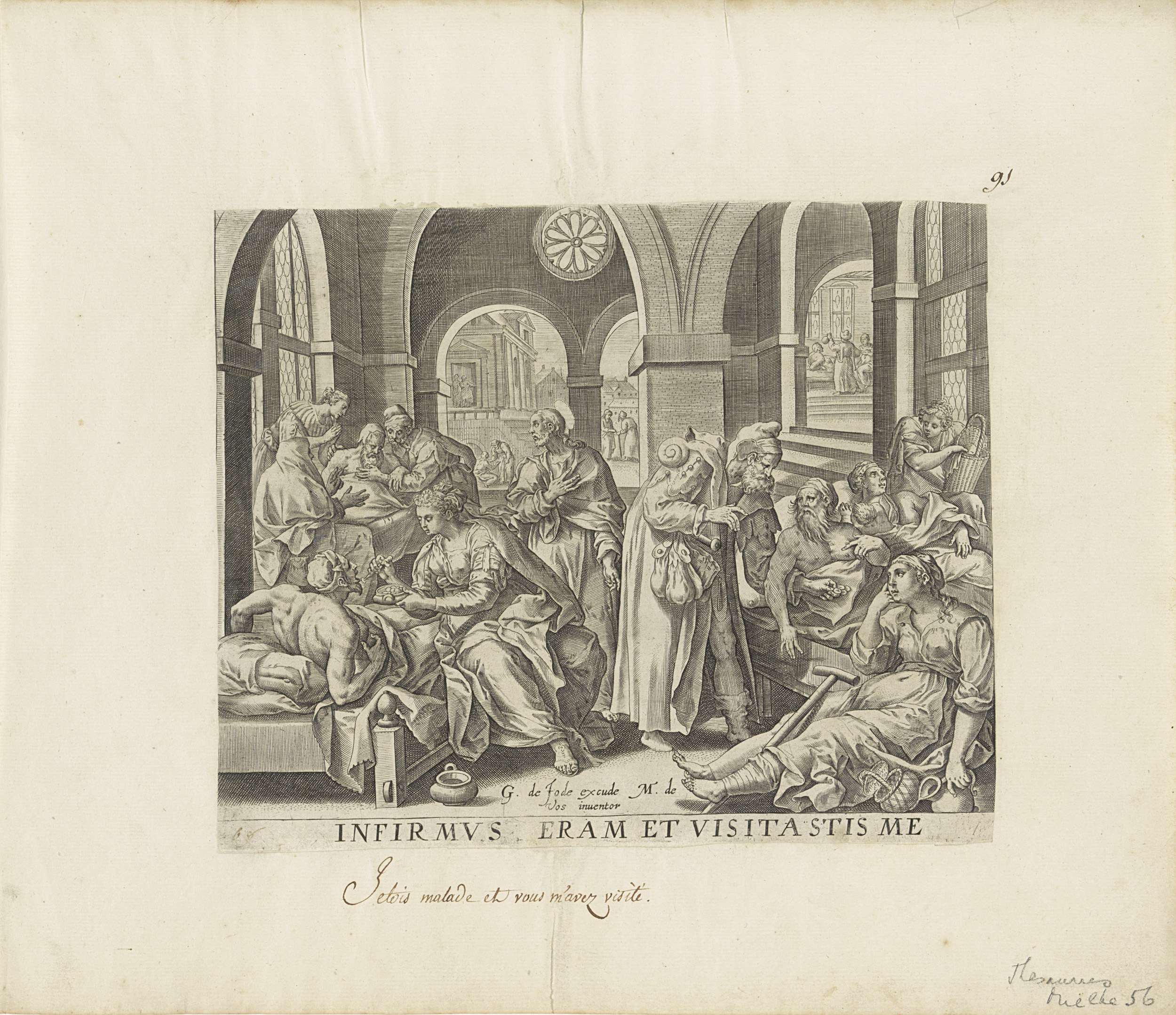 In een hospitaal verzorgen mensen de zieken. Links geeft een vrouw een man te eten. Rechts geeft een man wat geld weg. Christus staat in het midden van de ruimte. Onder de voorstelling een verwijzing in het Latijn naar de Bijbeltekst.