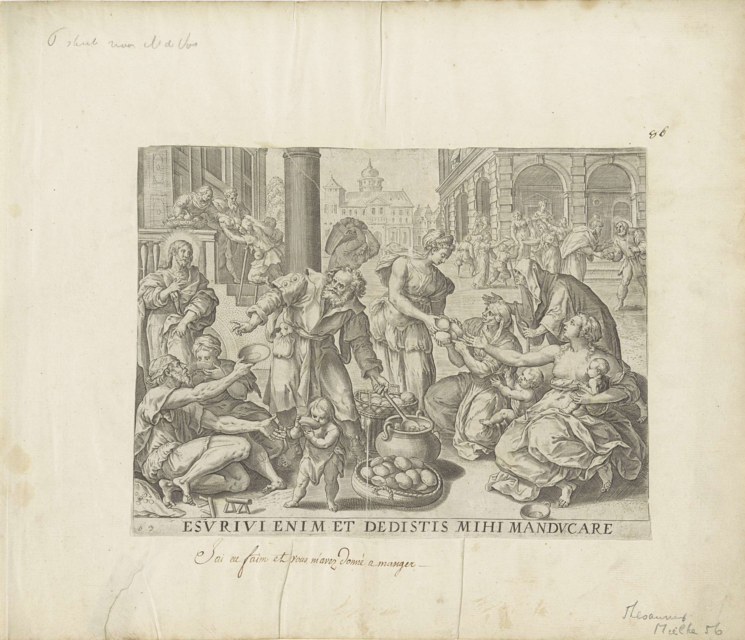 Op de voorgrond delen een man en een vrouw voedsel uit aan de hongerigen. Links kijkt Christus toe. Op de achtergrond wordt eveneens voedsel uitgedeeld. Onder de voorstelling een verwijzing in het Latijn naar de Bijbeltekst.