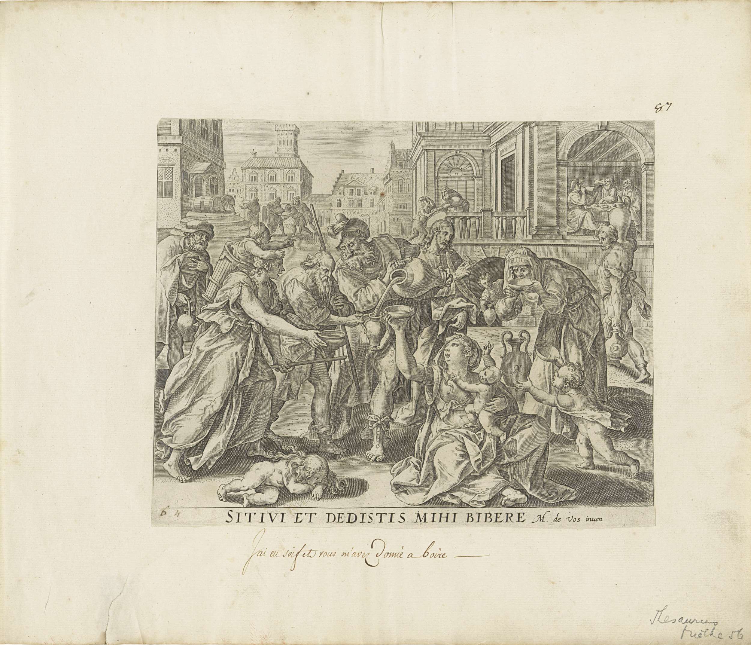 Een man schenkt uit een kruik drinken aan de dorstigen, die kommen en kruiken ophouden. Achter de man staat Christus. Op de achtergrond wordt eveneens drinken uitgedeeld. Onder de voorstelling een verwijzing in het Latijn naar de Bijbeltekst.
