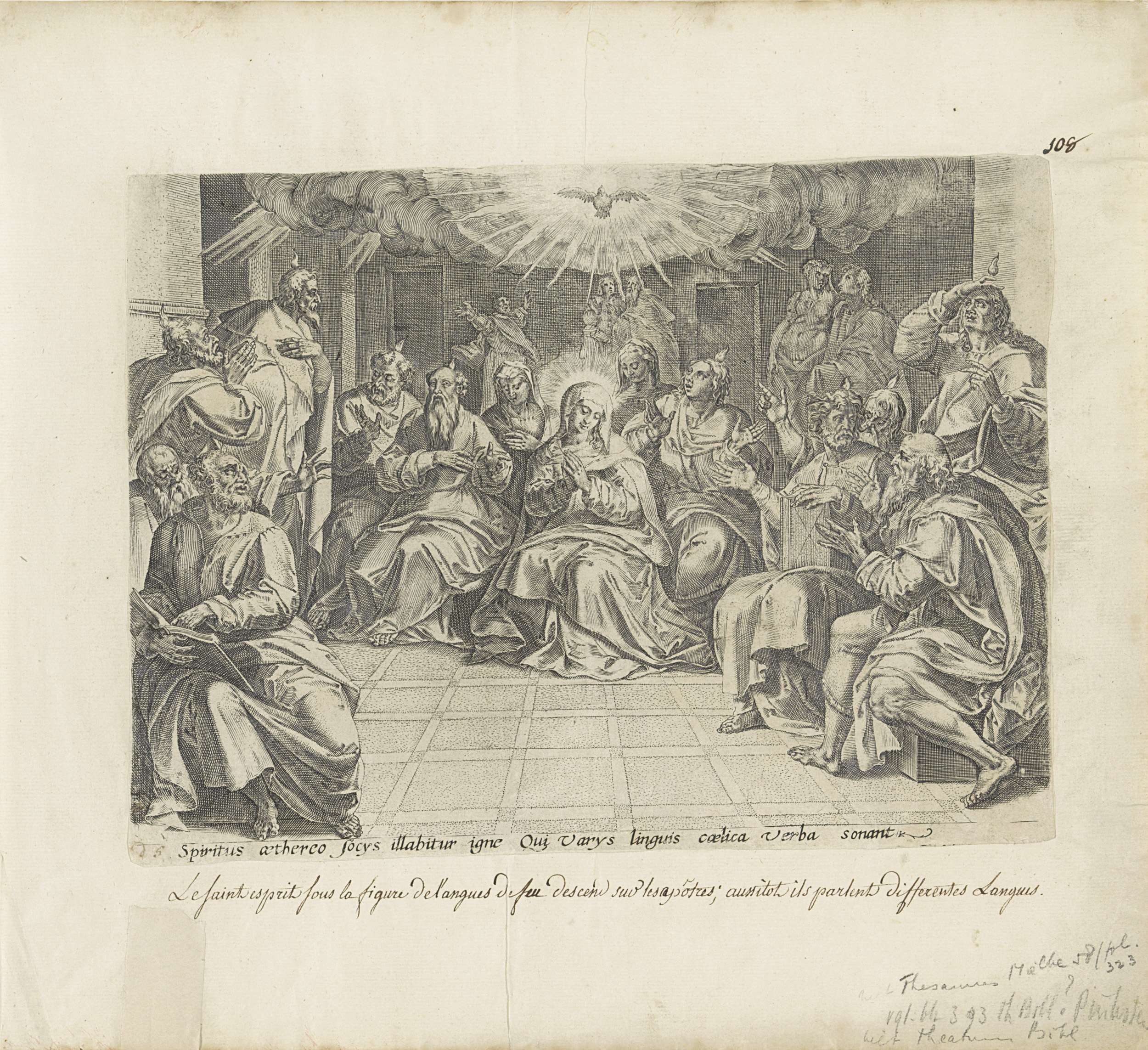 De heilige Geest verschijnt in de vorm van een duif en wordt uitgestort over Maria en de apostelen. Op de hoofden van hen verschijnen tongen van vuur. Onder de voorstelling een verwijzing in het Latijn naar de Bijbeltekst.