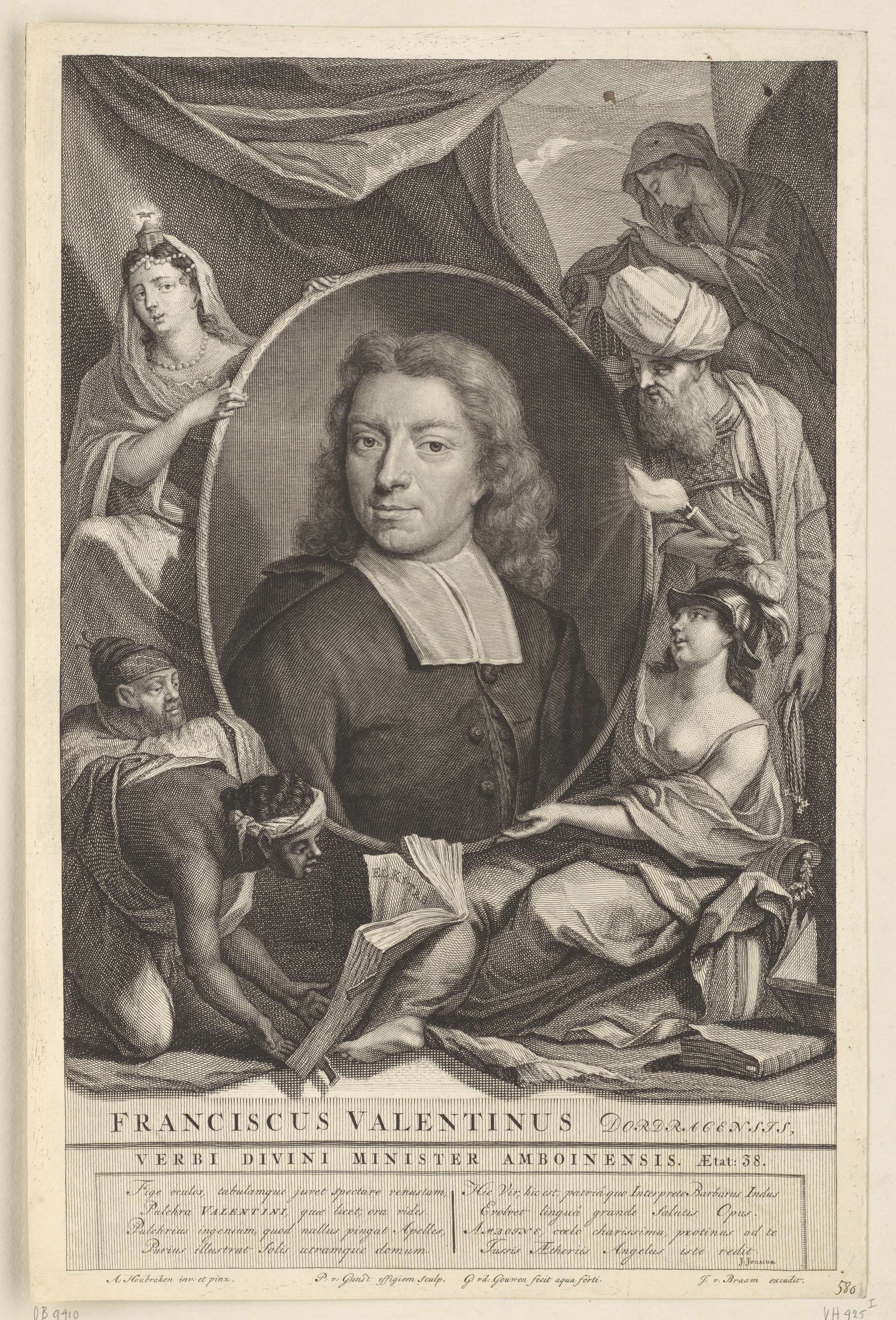 Portret van de historicus en dominee François Valentijn op 38-jarige leeftijd, in een ovaal medaillon, dat wordt vastgehouden door Minerva (de wetenschap) en het Geloof (vrouw met kerkgebouw en duif op haar hoofd). Het portret wordt omringd door oosterse figuren en boeken die verwijzen naar zijn reizen naar Azië en de werken die hij hierover ...