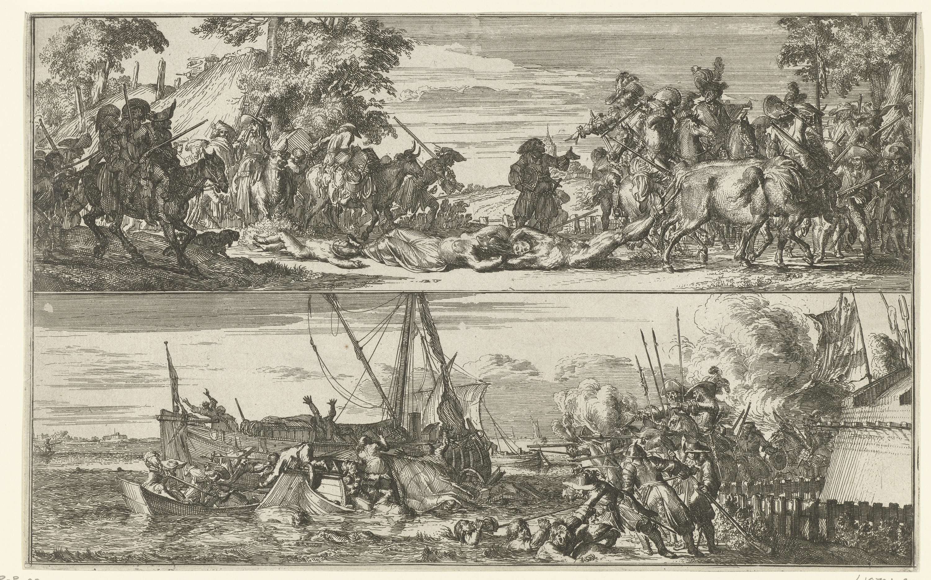 Twee voorstellingen van de wreedheden bedreven door de Franse troepen in Hollandse dorpen in het jaar 1672. In de bovenste voorstelling slepen Franse soldaten een man, vrouw en kind achter een os over de grond. Onder schieten soldaten op mensen die met een boot proberen te vluchten. Wellicht de gebeurtenissen te Waverveen en Botshol.