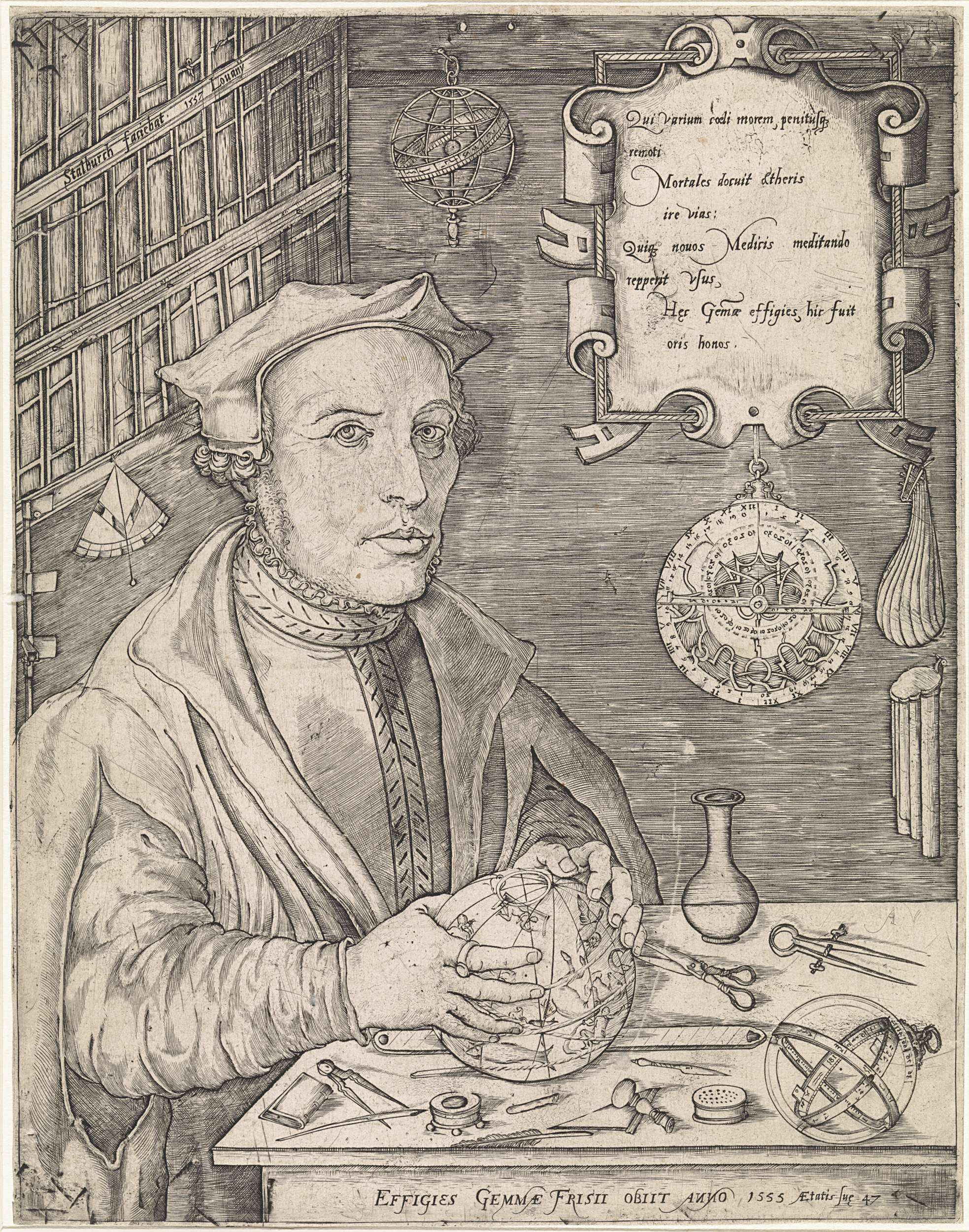 Portret van de geleerde Gemma Frisius, die schreef over de grondbeginselen van de astronomie en de kosmografie. Frisius zit in zijn studeervertrek met boekenkast, aan een tafel waarop een globe en verschillende astronomische instrumenten liggen. Hij draagt een paltrok en mantel en op zijn hoofd een bonnet.