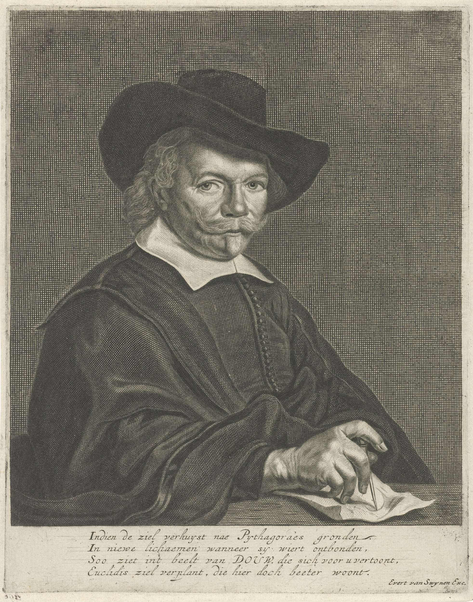 Portret van de wiskundige Jan Pietersz. Douw. Hij tekent met een passer op het vel papier dat voor hem ligt. In de marge een vierregelig lofdicht in het Nederlands.