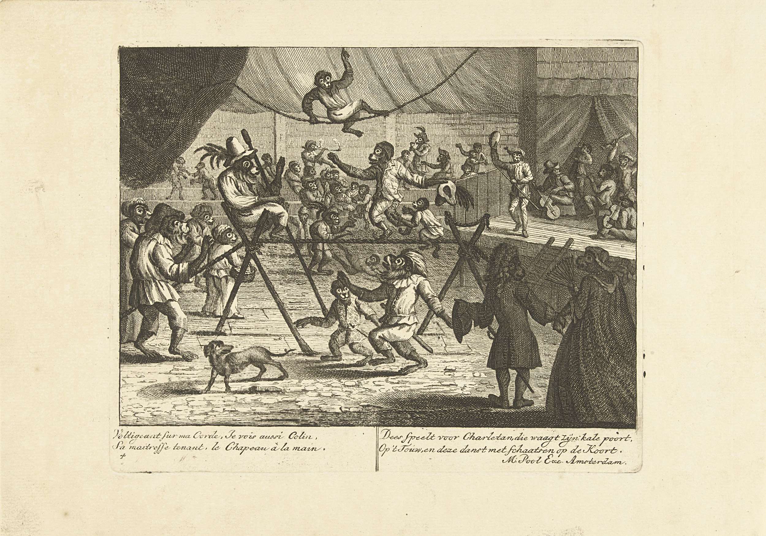 Circusvoorstelling met apen die koorddansen en muziek maken. In het onderschrift versjes in het Frans en Nederlands. Prent nr. 4 in een serie van 16 prenten van ca. 1720 waarin apen als mensen figureren in allerlei huishoudelijke taferelen.