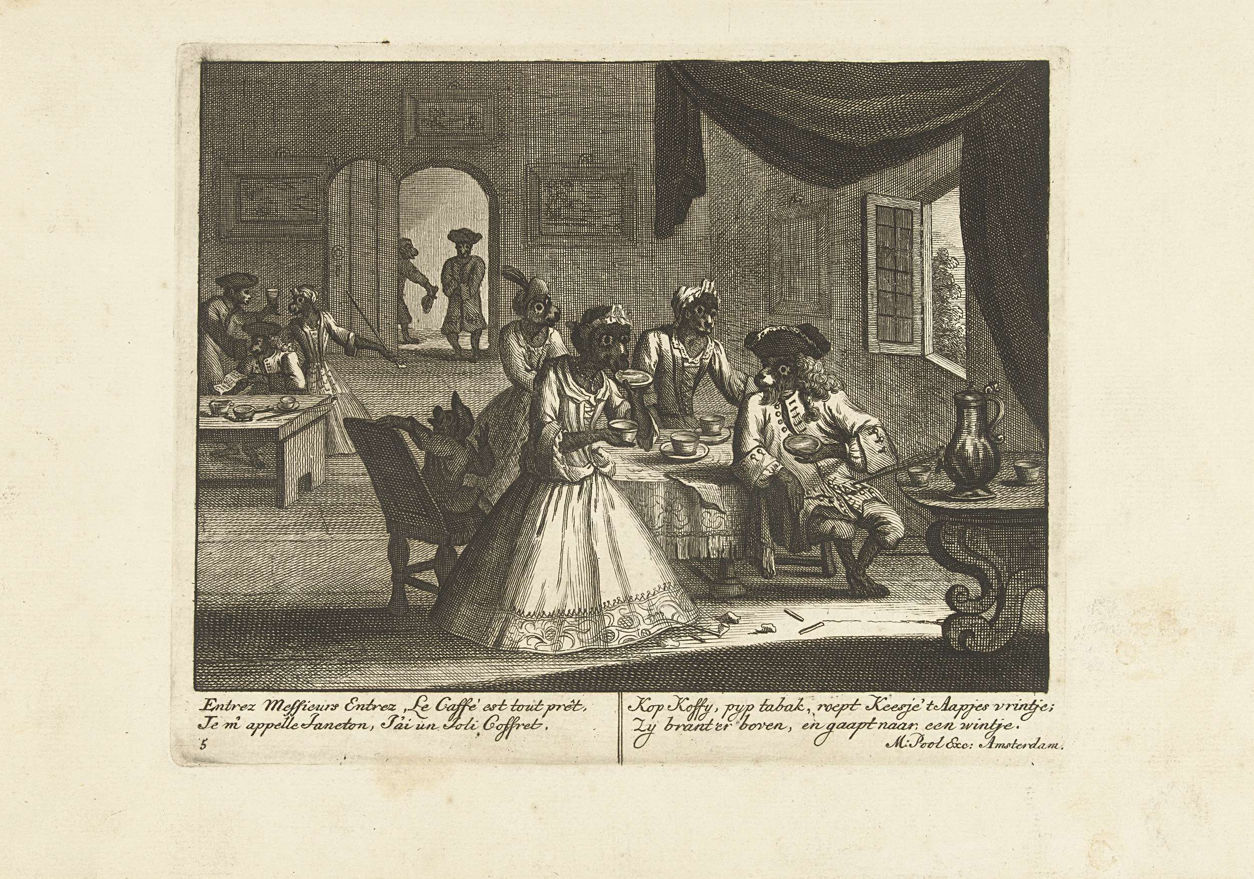 Interieur van een huiskamer of koffiehuis met apen die koffiedrinken. In het onderschrift versjes in het Frans en Nederlands. Prent nr. 5 in een serie van 16 prenten van ca. 1720 waarin apen als mensen figureren in allerlei huishoudelijke taferelen.