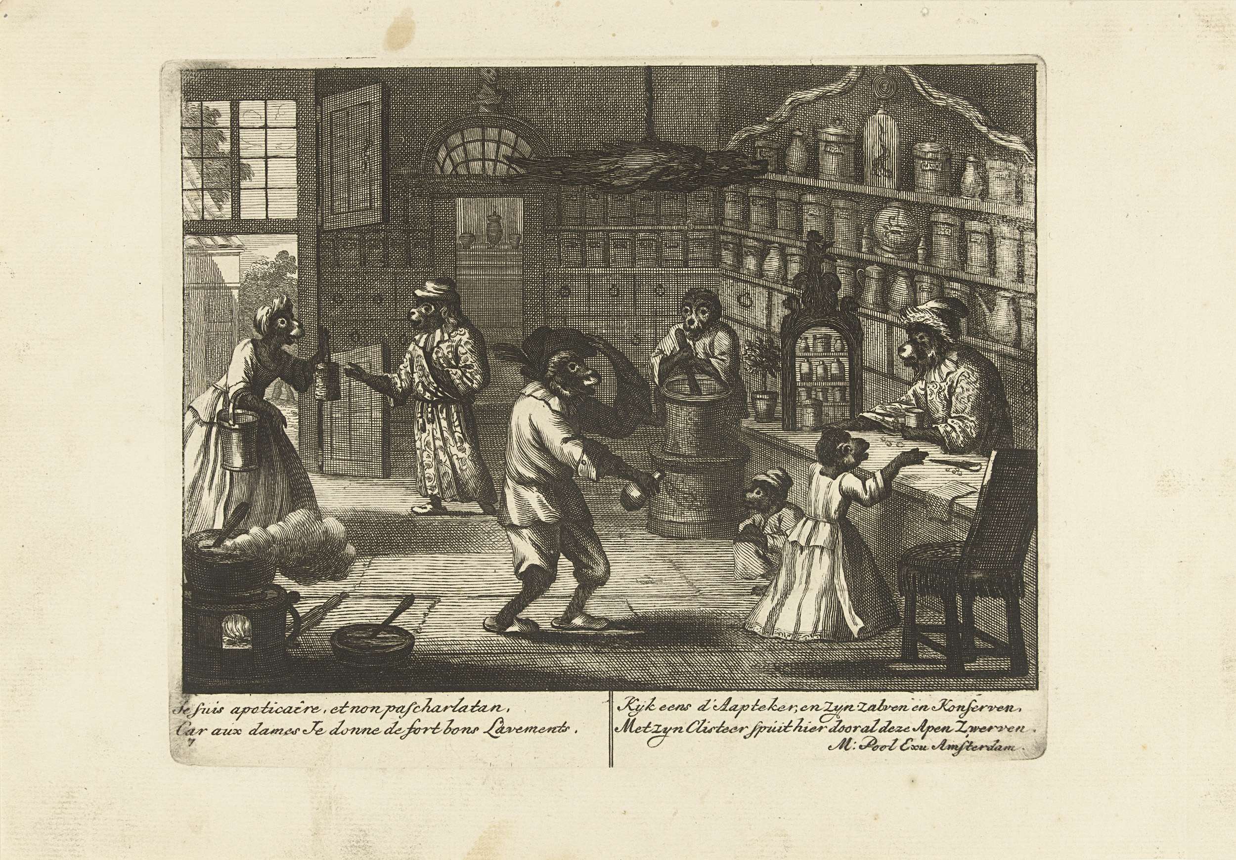 Apen als apothekers en klanten in een apotheek. In het onderschrift versjes in het Frans en Nederlands. Prent nr. 7 in een serie van 16 prenten van ca. 1720 waarin apen als mensen figureren in allerlei huishoudelijke taferelen.