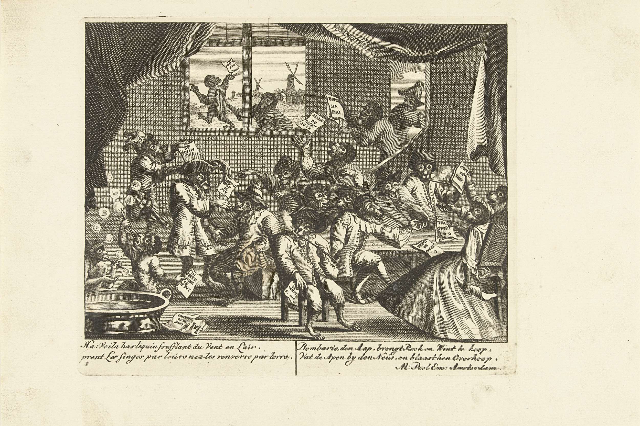 Apen bezig met de windhandel. In het onderschrift versjes in het Frans en Nederlands. Prent nr. 8 in een serie van 16 prenten van ca. 1720 waarin apen als mensen figureren in allerlei huishoudelijke taferelen.