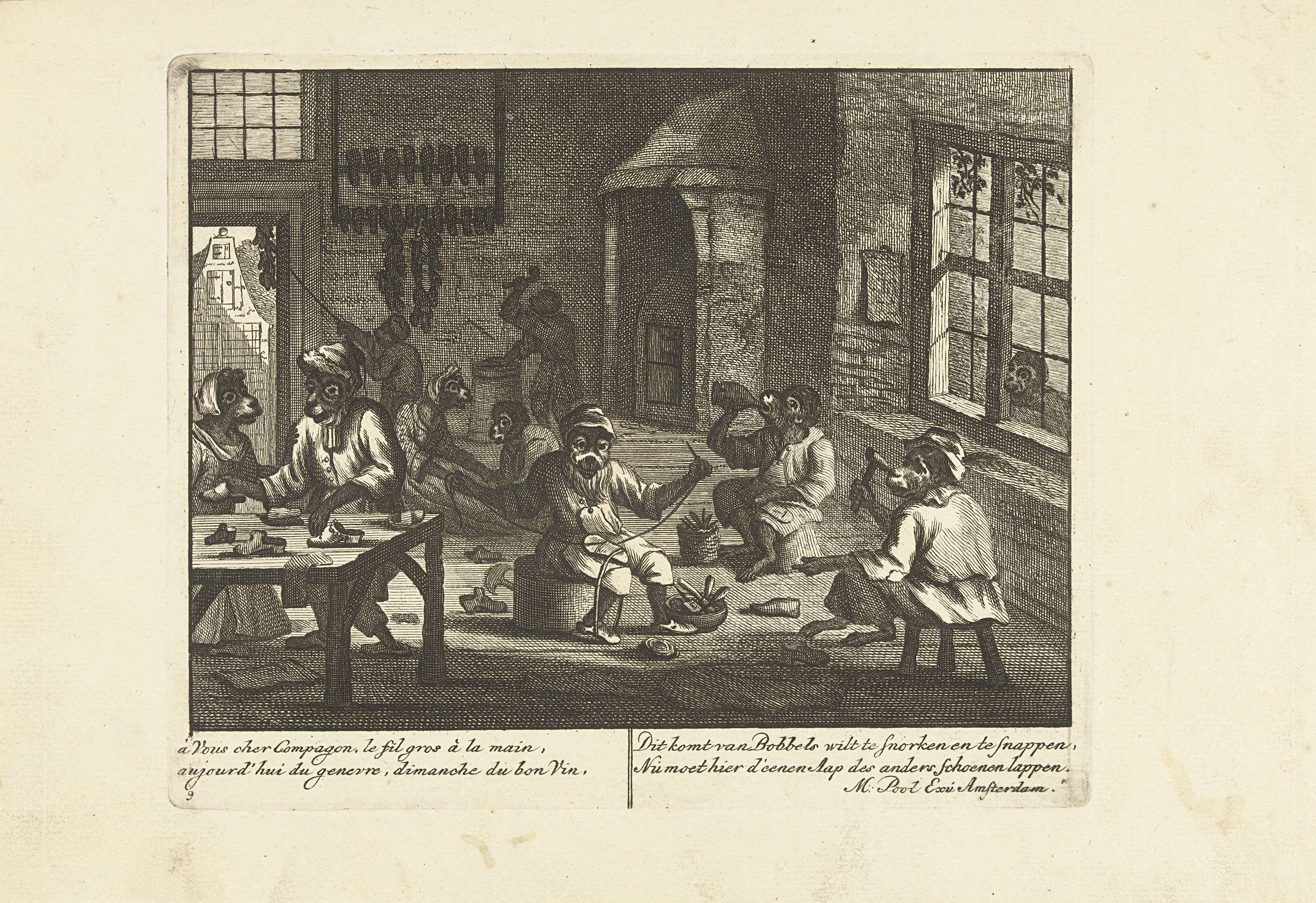 Apen als schoenmakers in een werkplaats. In het onderschrift versjes in het Frans en Nederlands. Prent nr. 9 in een serie van 16 prenten van ca. 1720 waarin apen als mensen figureren in allerlei huishoudelijke taferelen.