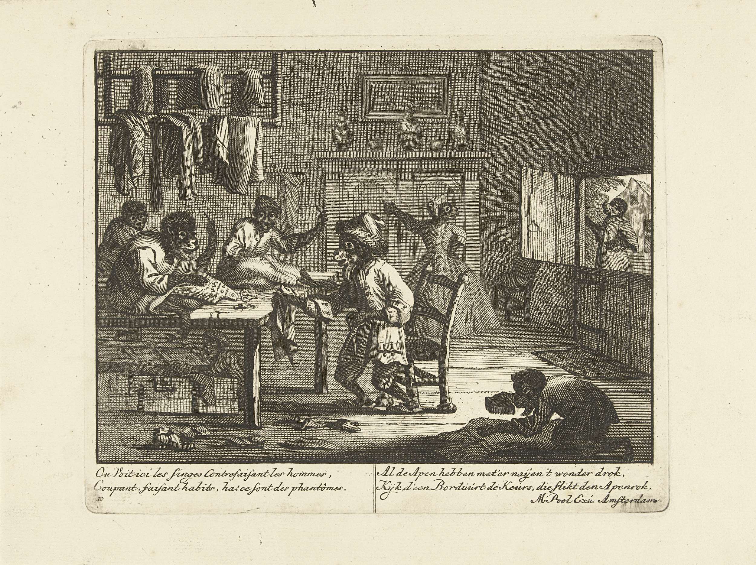 Apen werkzaam als kleeermakers. In het onderschrift versjes in het Frans en Nederlands. Prent nr. 10 in een serie van 16 prenten van ca. 1720 waarin apen als mensen figureren in allerlei huishoudelijke taferelen.