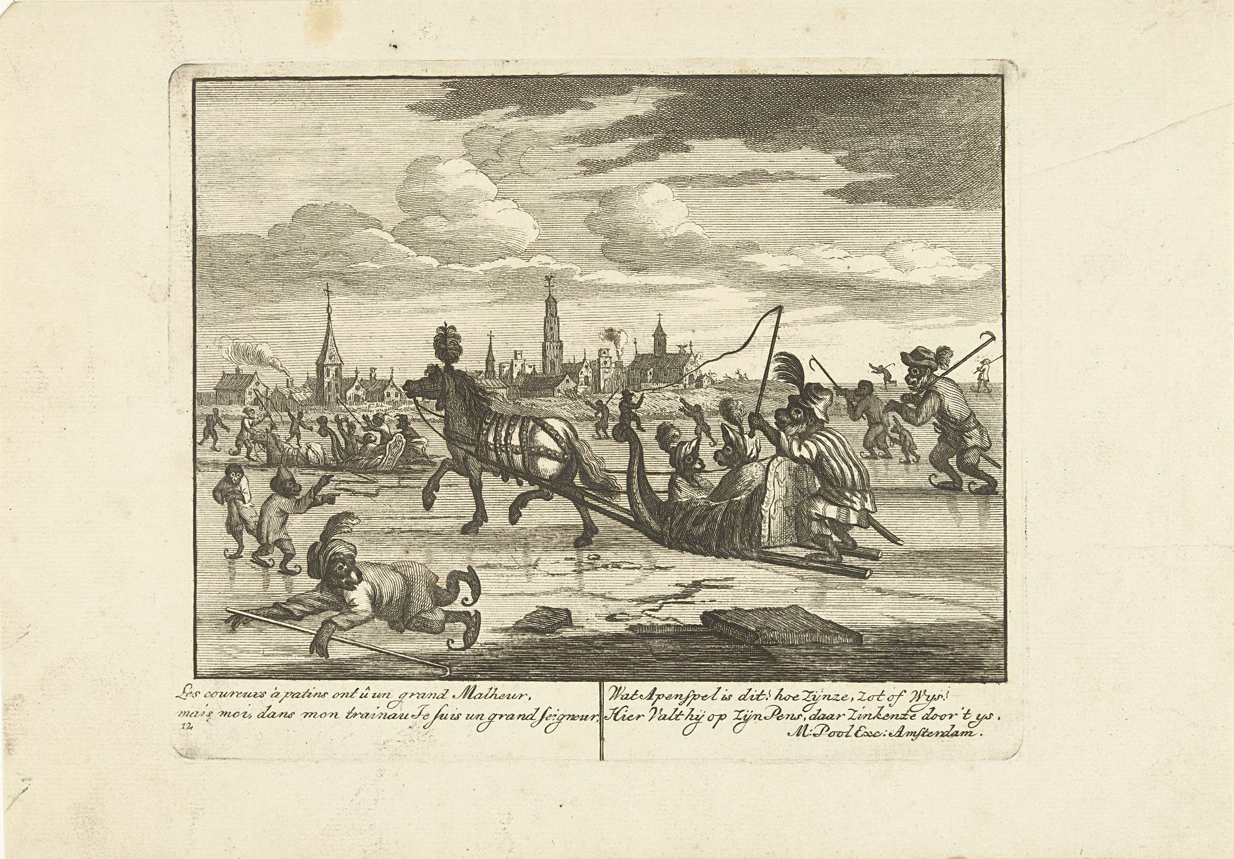 IJsvermaak met apen buiten een stad. In het onderschrift versjes in het Frans en Nederlands. Prent nr. 12 in een serie van 16 prenten van ca. 1720 waarin apen als mensen figureren in allerlei huishoudelijke taferelen.