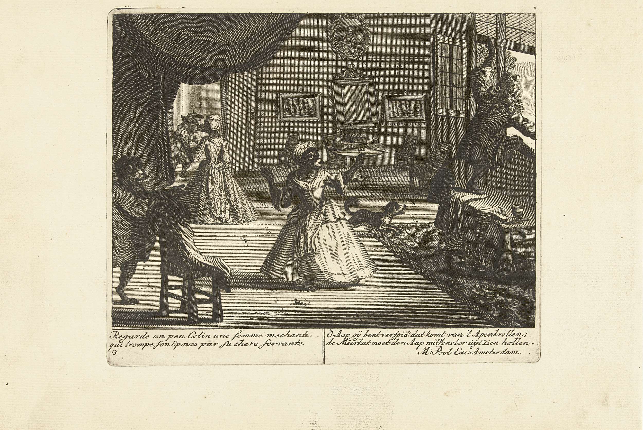Een aap vlucht als betrapte minnaar uit een raam wanneer de echtgenoot thuiskomt. In het onderschrift versjes in het Frans en Nederlands. Prent nr. 13 in een serie van 16 prenten van ca. 1720 waarin apen als mensen figureren in allerlei huishoudelijke taferelen.