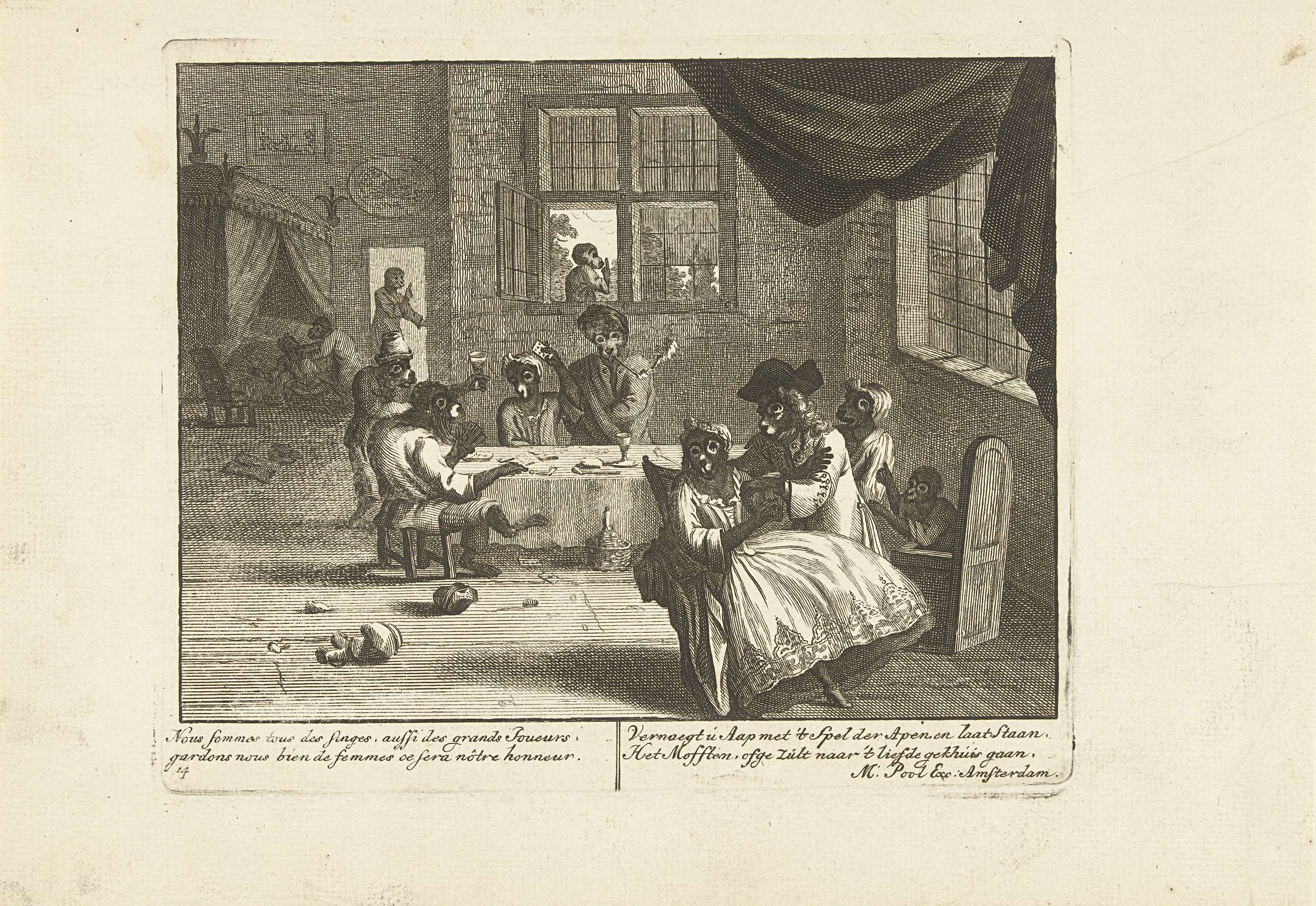 Apen vermaken zich in de herberg met drinken, roken, kaarten en vrijen. In het onderschrift versjes in het Frans en Nederlands. Prent nr. 14 in een serie van 16 prenten van ca. 1720 waarin apen als mensen figureren in allerlei huishoudelijke taferelen.
