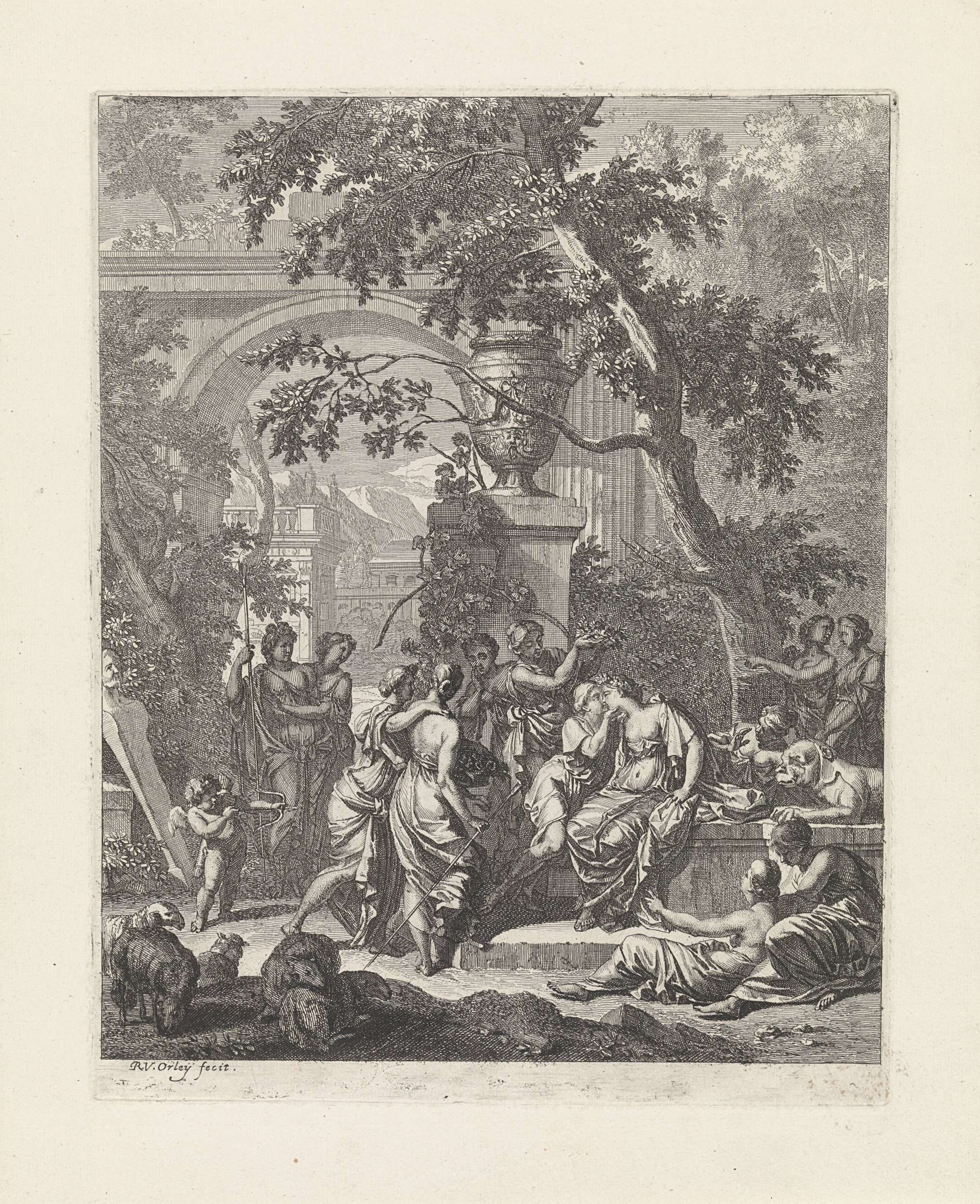 Mirtillo zit onder een boom in een tuin. Amaryllis zit naast hem en kust hem. Zij worden omringd door een groepje nimfen. Amor vuurt een pijl op hen af. Prent uit een serie van 12 prenten die het toneelstuk Il pastor fido illustreren, 1e scène uit de 2e akte.