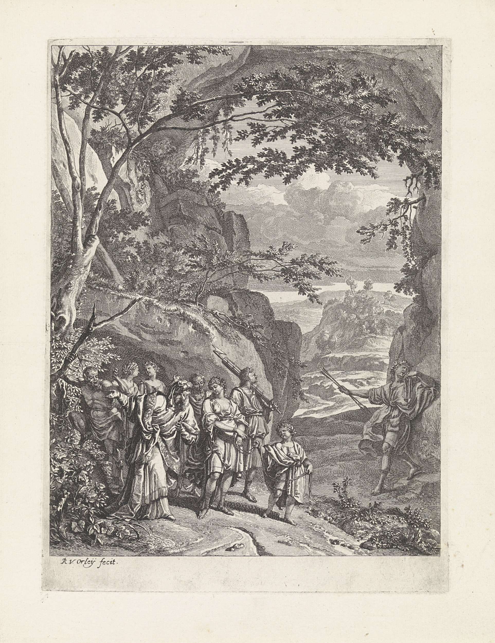 Nicander laat Amaryllis gevangennemen en wegvoeren. De bedroefde Mirtillo, haar geliefde, leunt rechts tegen een rots. Prent uit een serie van 12 prenten die het toneelstuk Il pastor fido illustreren, 3e scène uit de 4 akte.
