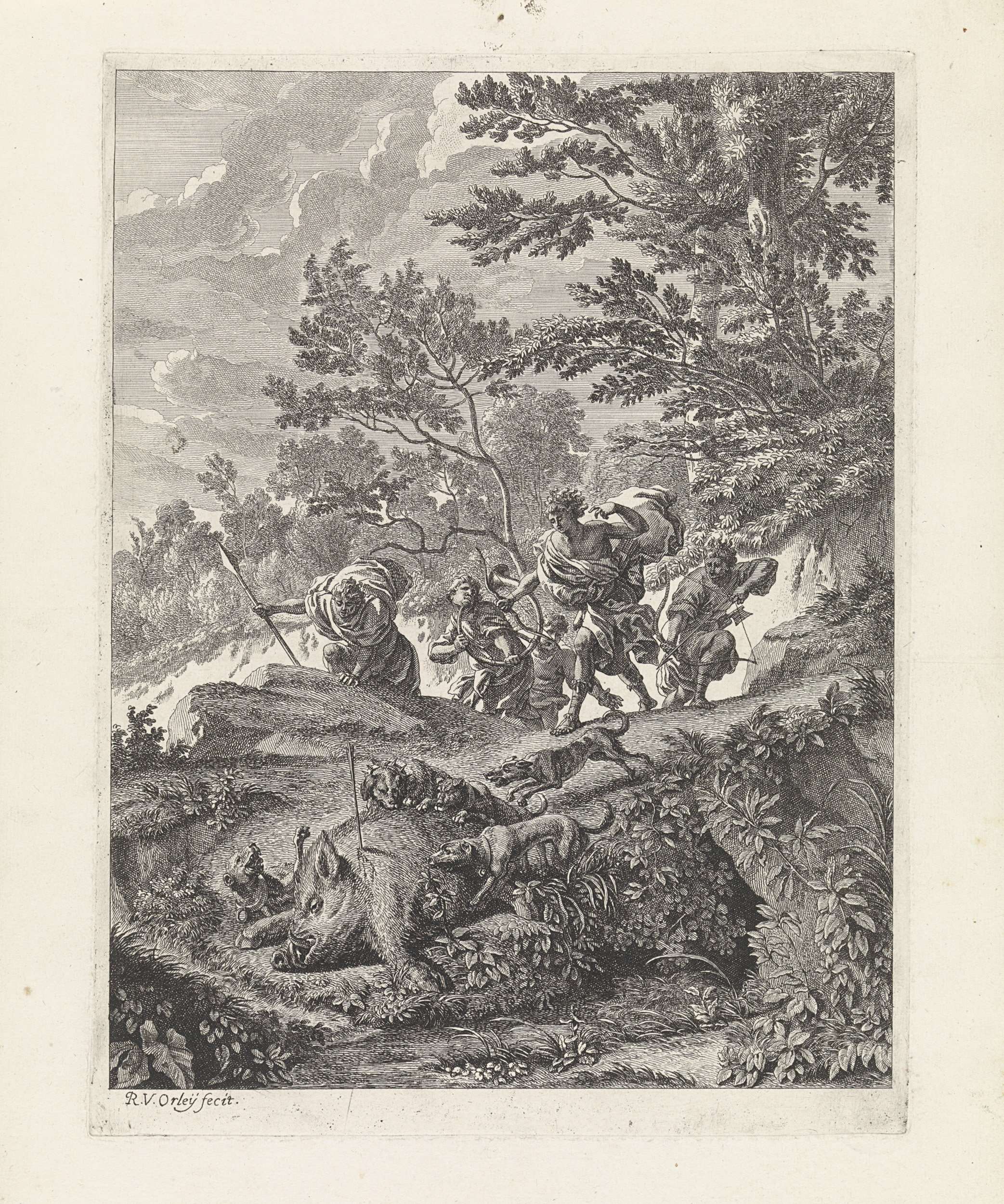 Op de jacht doodt Silvio het grote wilde zwijn dat al lang de oogsten van de boeren in gevaar brengt. Zijn honden stormen af op de prooi. Prent uit een serie van 12 prenten die het toneelstuk Il pastor fido illustreren, 2e scène uit de 4e akte.