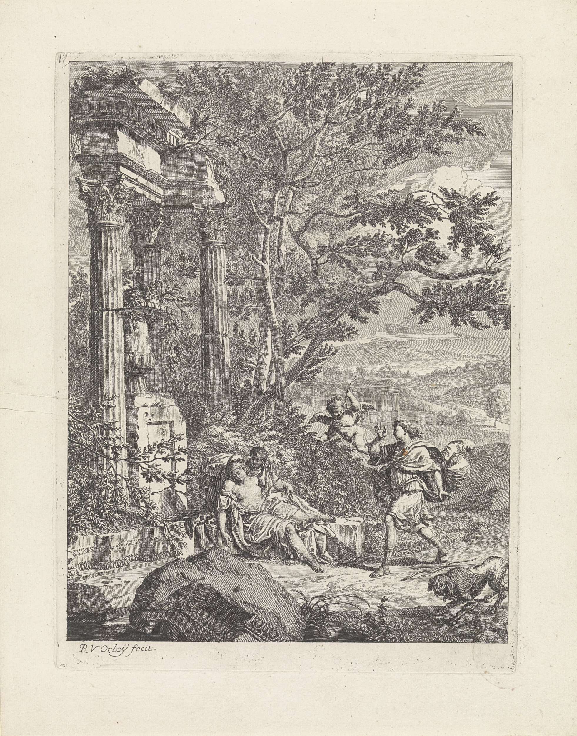 Silvio vuurt per ongeluk bij de jacht een pijl op de nimf Dorinda af. Hij raakt haar met de pijl in haar zij. Prent uit een serie van 12 prenten die het toneelstuk Il pastor fido illustreren, 8e scène uit de 4e akte.
