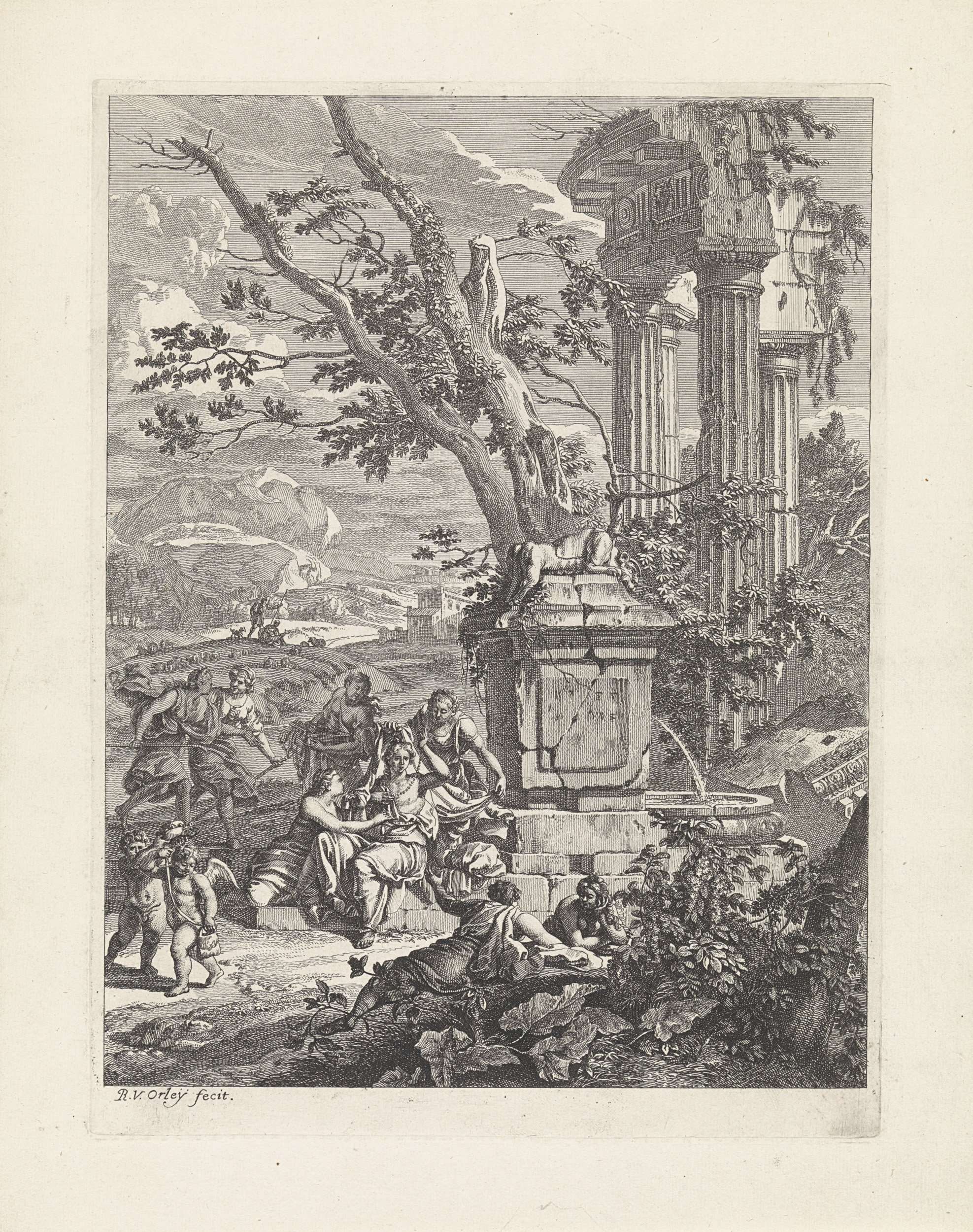 Mirtillo wordt door de nimfen verkleed als nimf om dichterbij zijn geliefde Amaryllis te kunnen komen. Op de achtergrond de andere herders op het veld. Prent uit een serie van 12 prenten die het toneelstuk Il pastor fido illustreren, 1e scène uit de 2e akte.