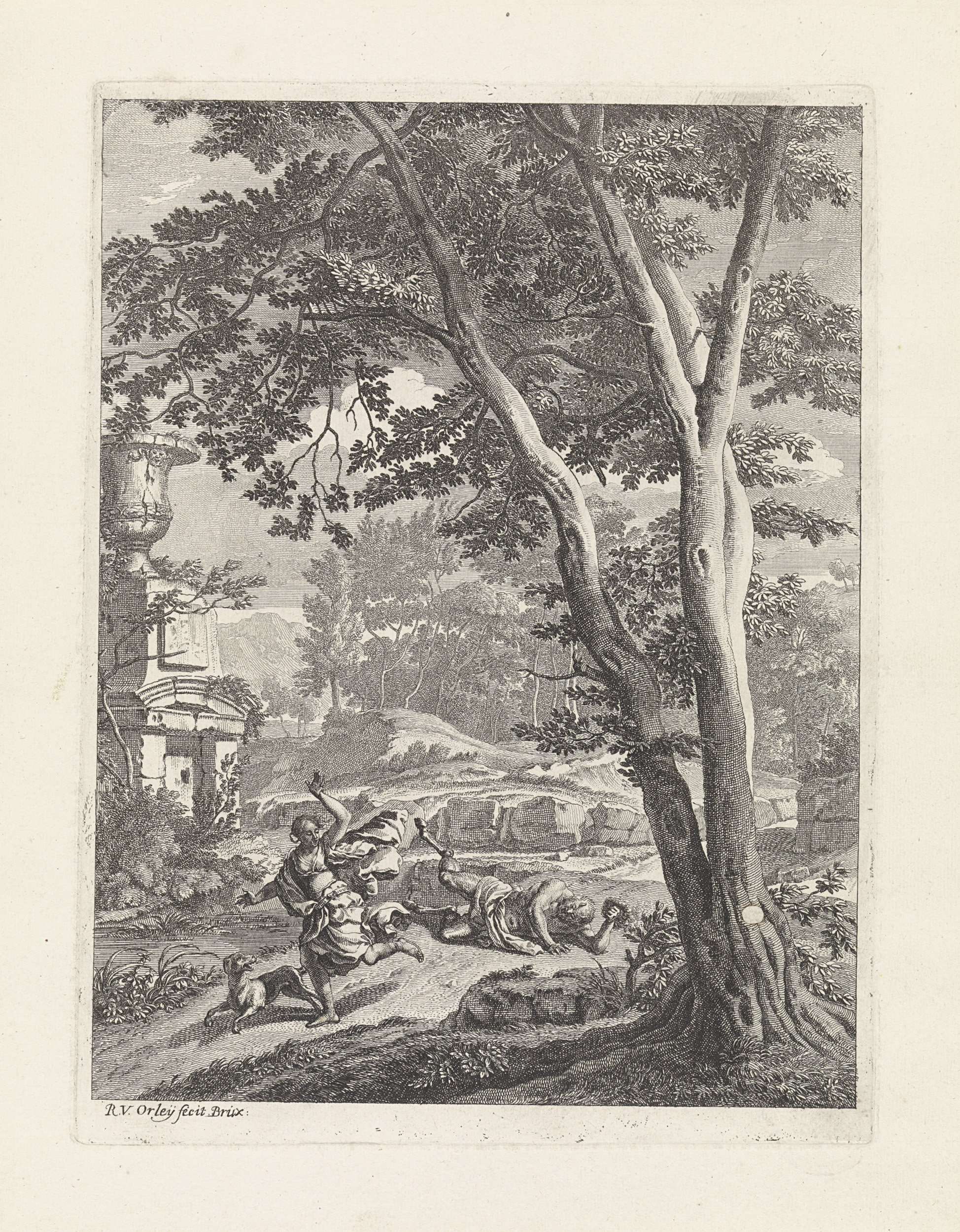 Corisca kan zich vrij maken uit de handen van de sater. De sater ligt op de grond, Coriscas vlecht in zijn hand. Prent uit een serie van 12 prenten die het toneelstuk Il pastor fido illustreren, 6e scène uit de 2e akte.