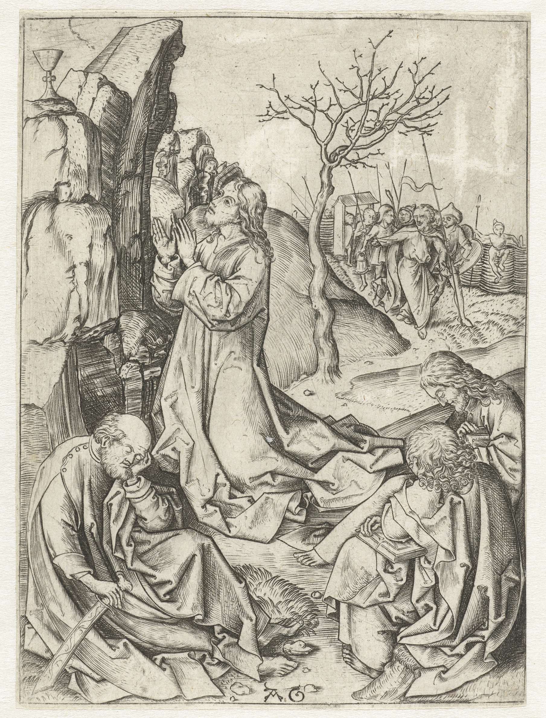 Christus biddend op de olijfberg, een kelk op de rots voor hem. Petrus en twee andere discipelen zijn in slaap gevallen, in de verte komt Judas met een groep soldaten aan. Derde prent uit een serie van twaalf.