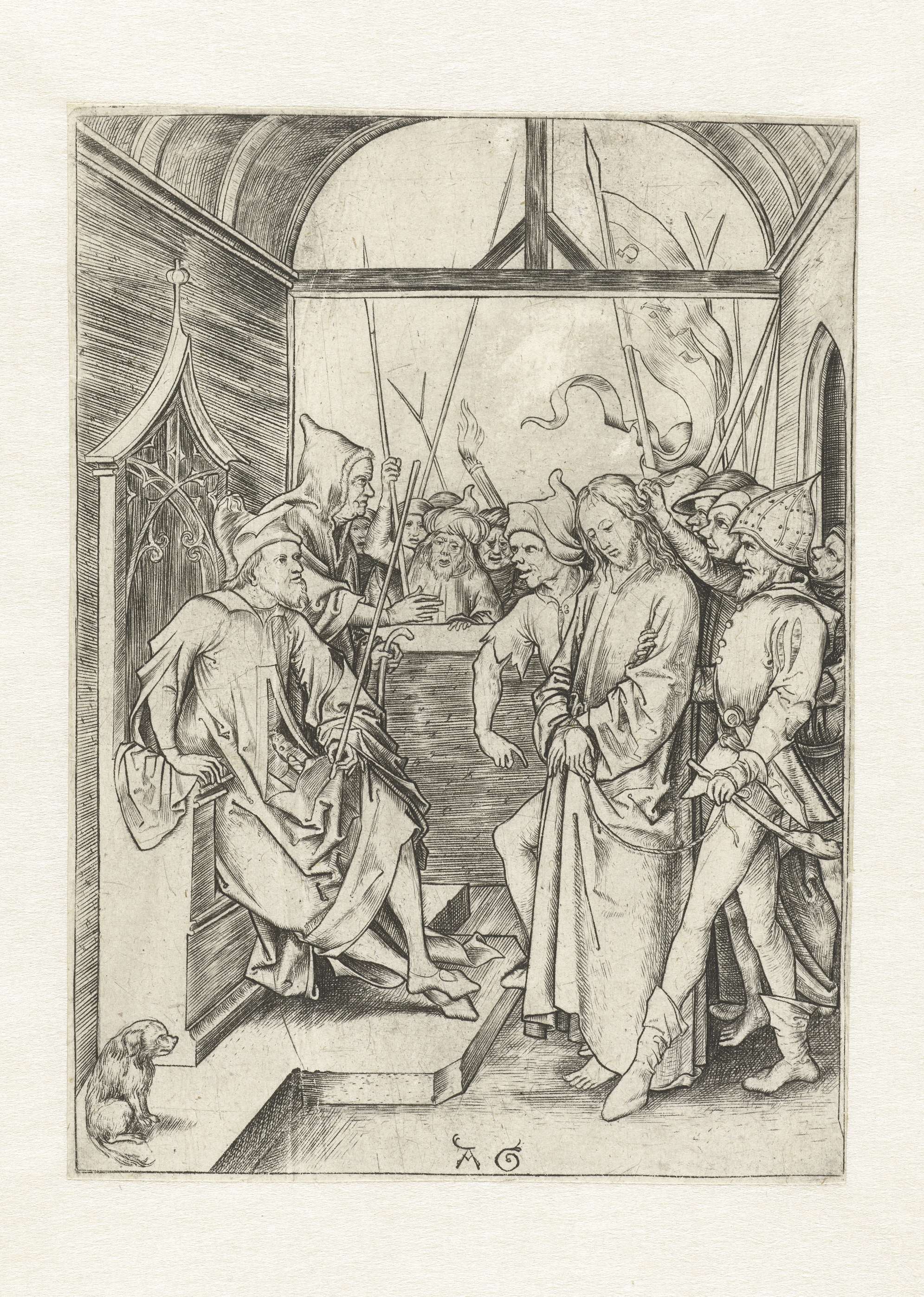 Christus, vastgehouden en getreiterd door soldaten, wordt aan Pilatus getoond in diens paleis. Buiten staat een woedende menigte. Vijfde prent uit een serie van twaalf.