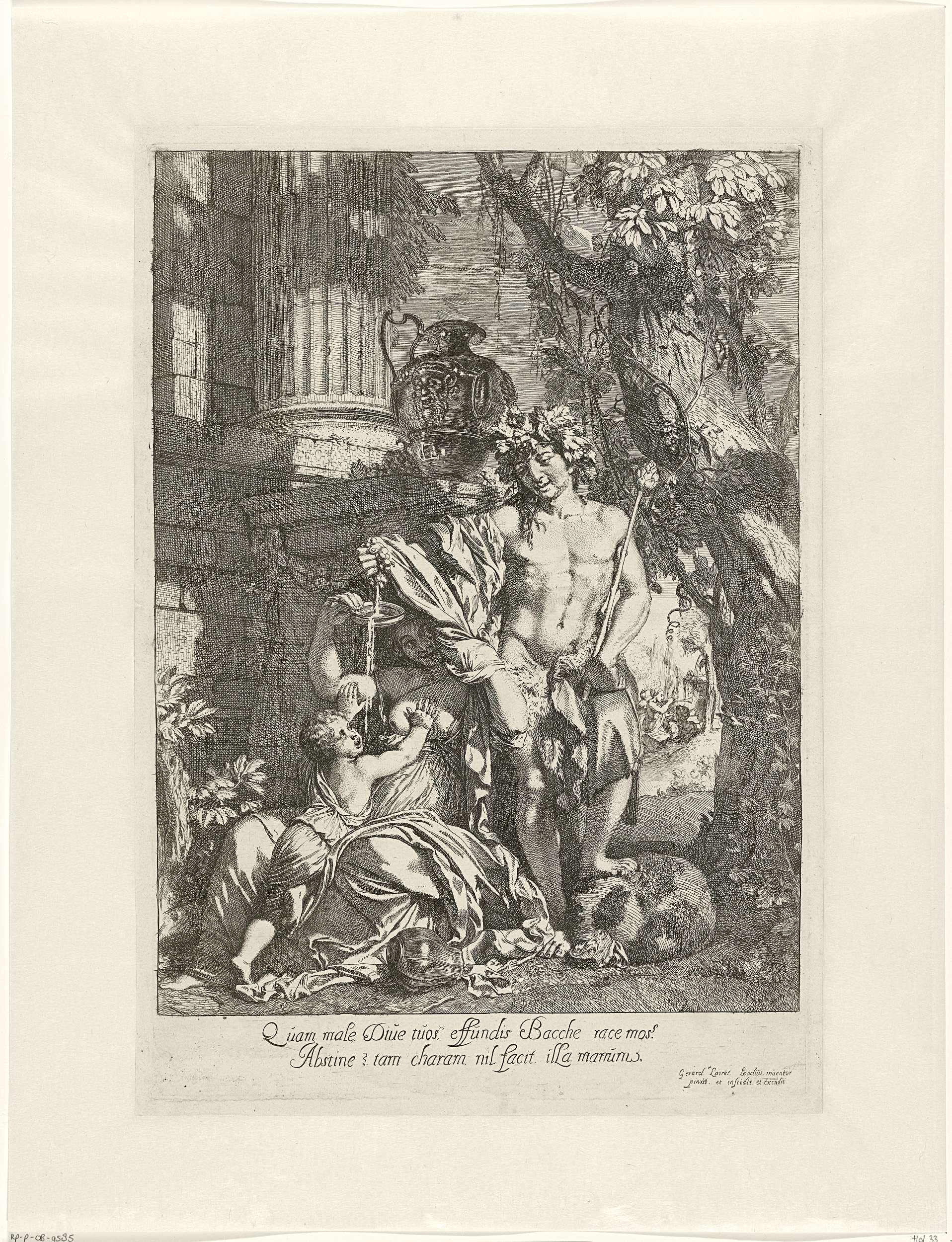 Bacchus, gekroond met wingerdbladeren en druiven, staat in een landschap met een thyrsus en een tros druiven in zijn handen. Hij knijpt de druiventros fijn en laat het sap opvangen in een schaaltje dat door een maenade wordt vastgehouden. Het kind dat bij de maenade zit probeert wat van het druivensap op te vangen. Rechts ...