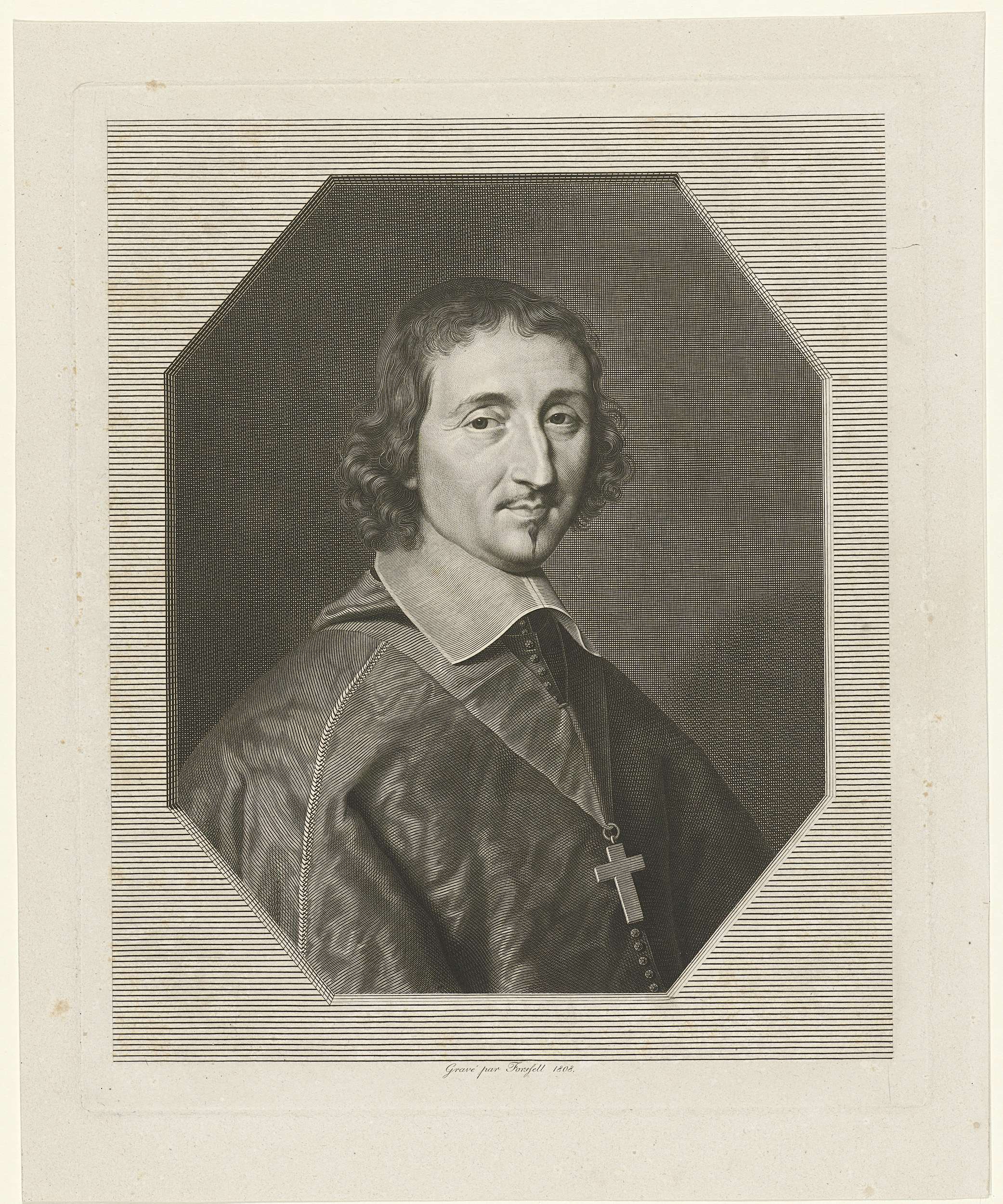 Portretbuste naar rechts van bisschop Ferdinand de Neufville, met kalot. Portret in achthoekige lijst.