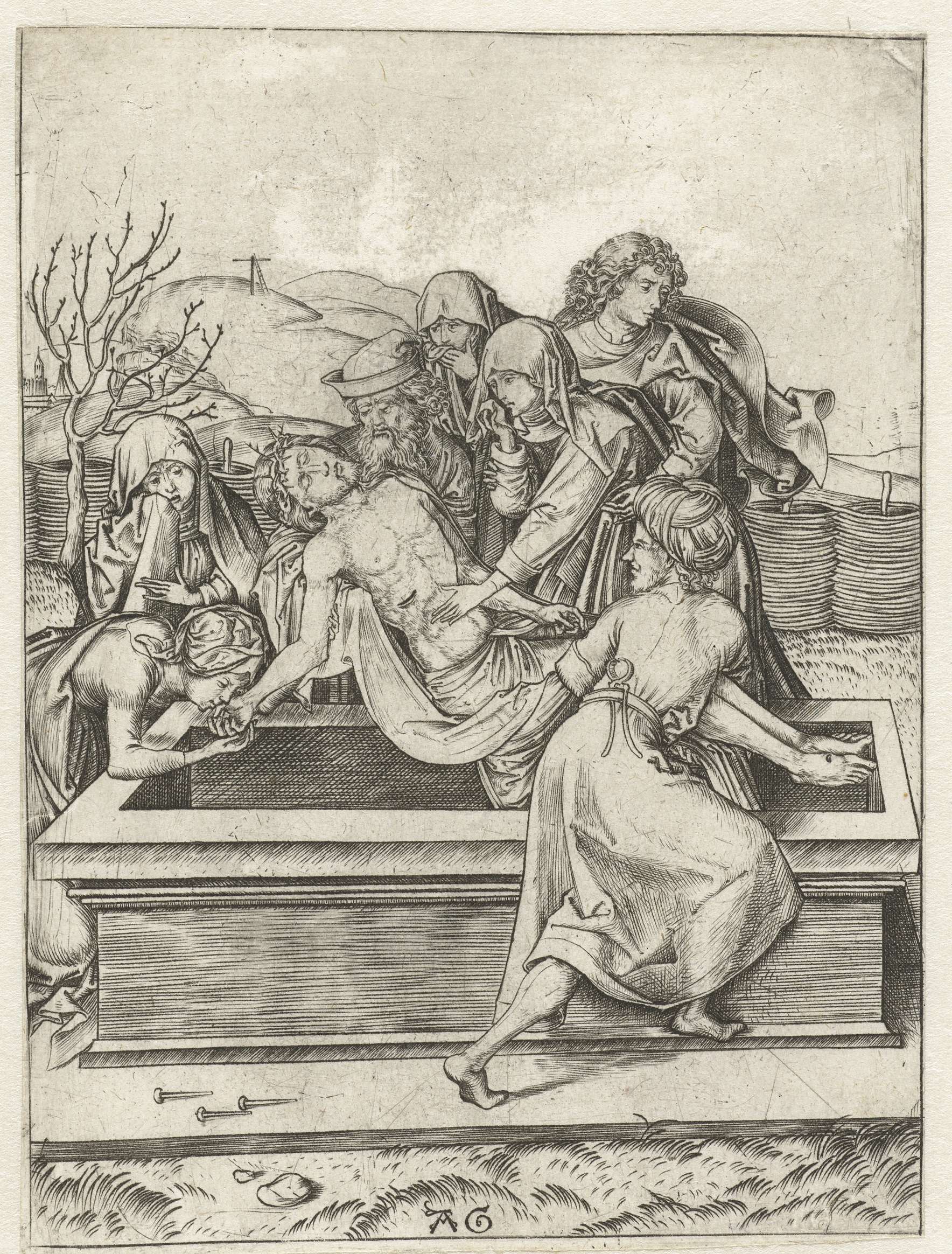 Het lichaam van Christus wordt in het graf gelegd. Maria, Johannes en de drie Maria's bewenen het lichaam.