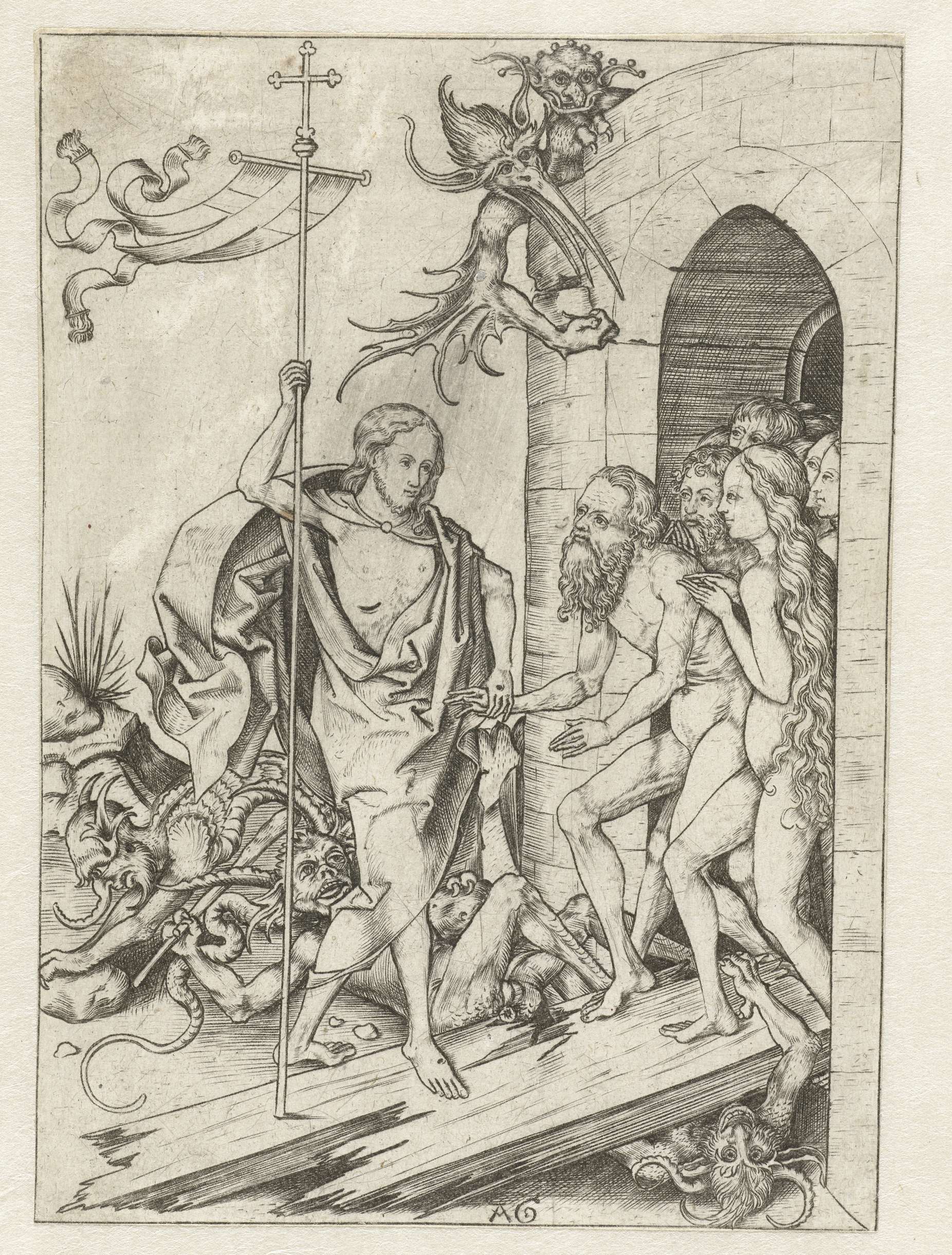 Christus heeft de poort van de hel opengebroken, onder de deur zijn duivels verpletterd. Adam en Eva worden door Christus uit de hel getrokken, gevolgd door een groep mensen.