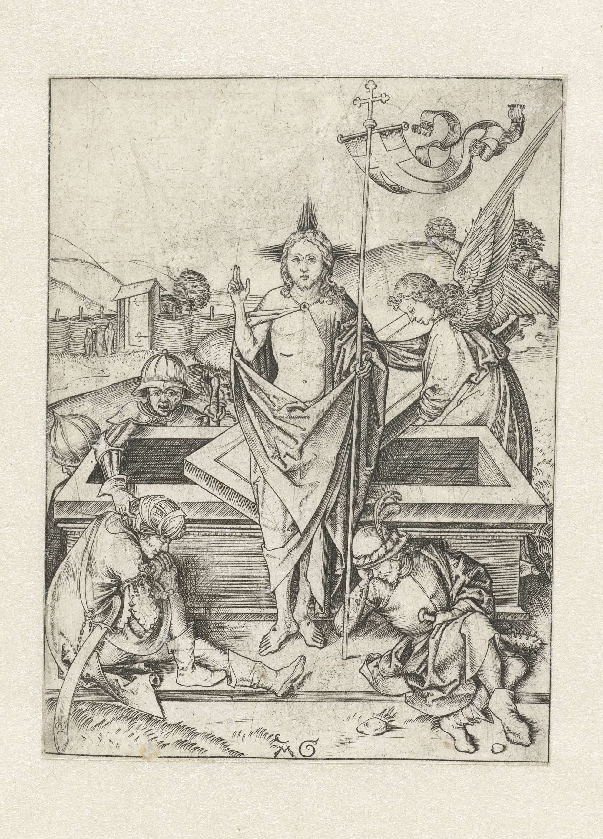 Christus, opgestaan uit het graf, staat vóór de geopende tombe, een engel houdt de deksel vast. Een soldaat probeert één van de andere slapende soldaten te wekken.