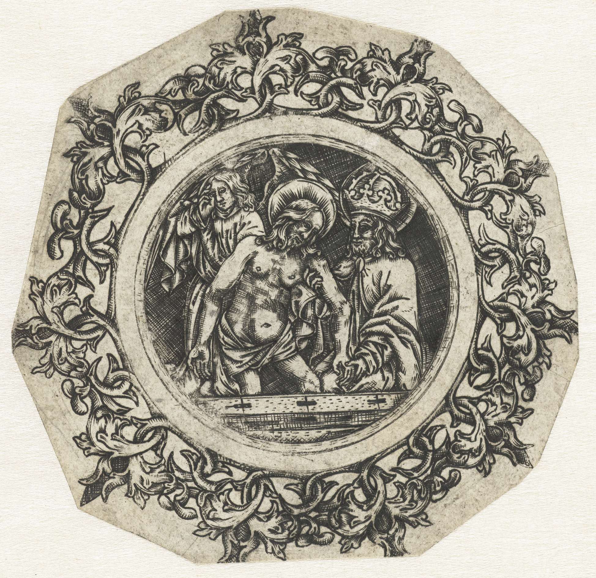 God de Vader met het lichaam van Christus staand in een graf, achter hen een wenende engel. In een omlijsting van bladranken.