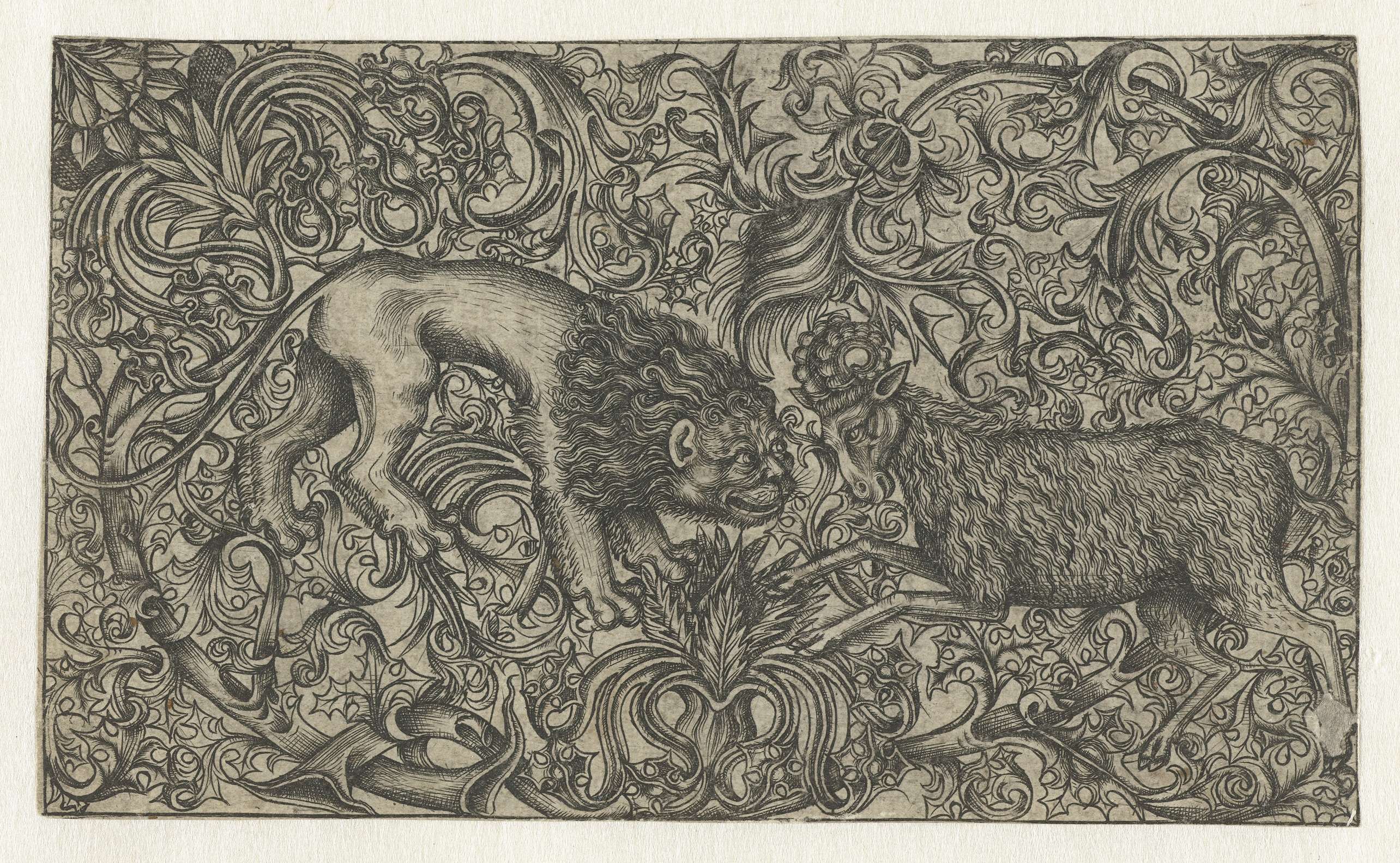 Een leeuw en een ram tussen bladranken, bestaande uit twee grote takken met bloemen en bladeren.