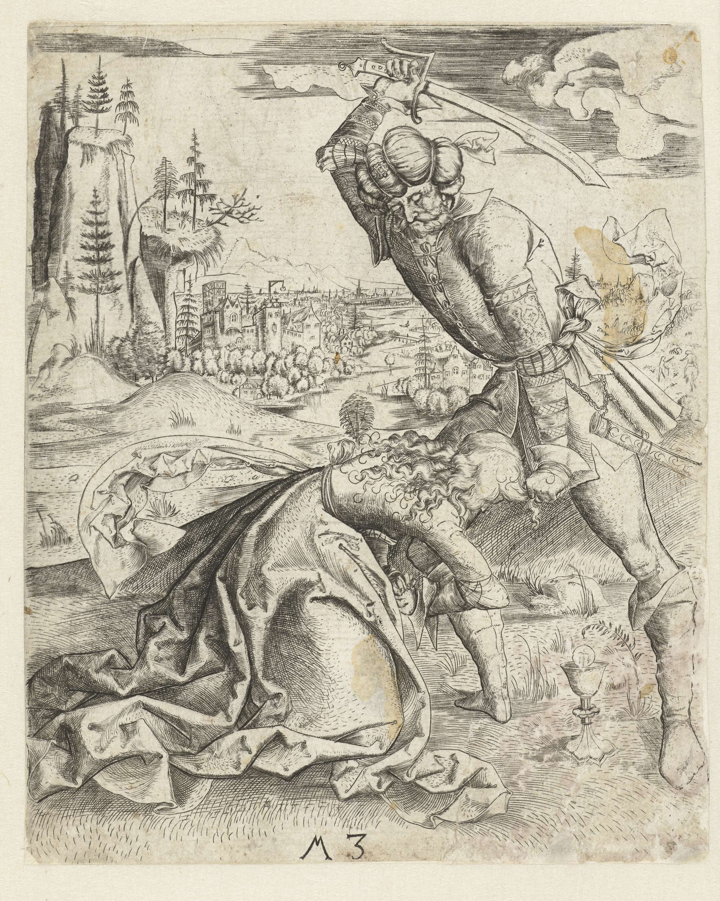 De vader van de Heilige Barbara staat klaar zijn dochter met het zwaard terecht te stellen. Voor haar op de grond staat een miskelk met een hostie. Op de achtergrond enkele huizen aan een rivier.