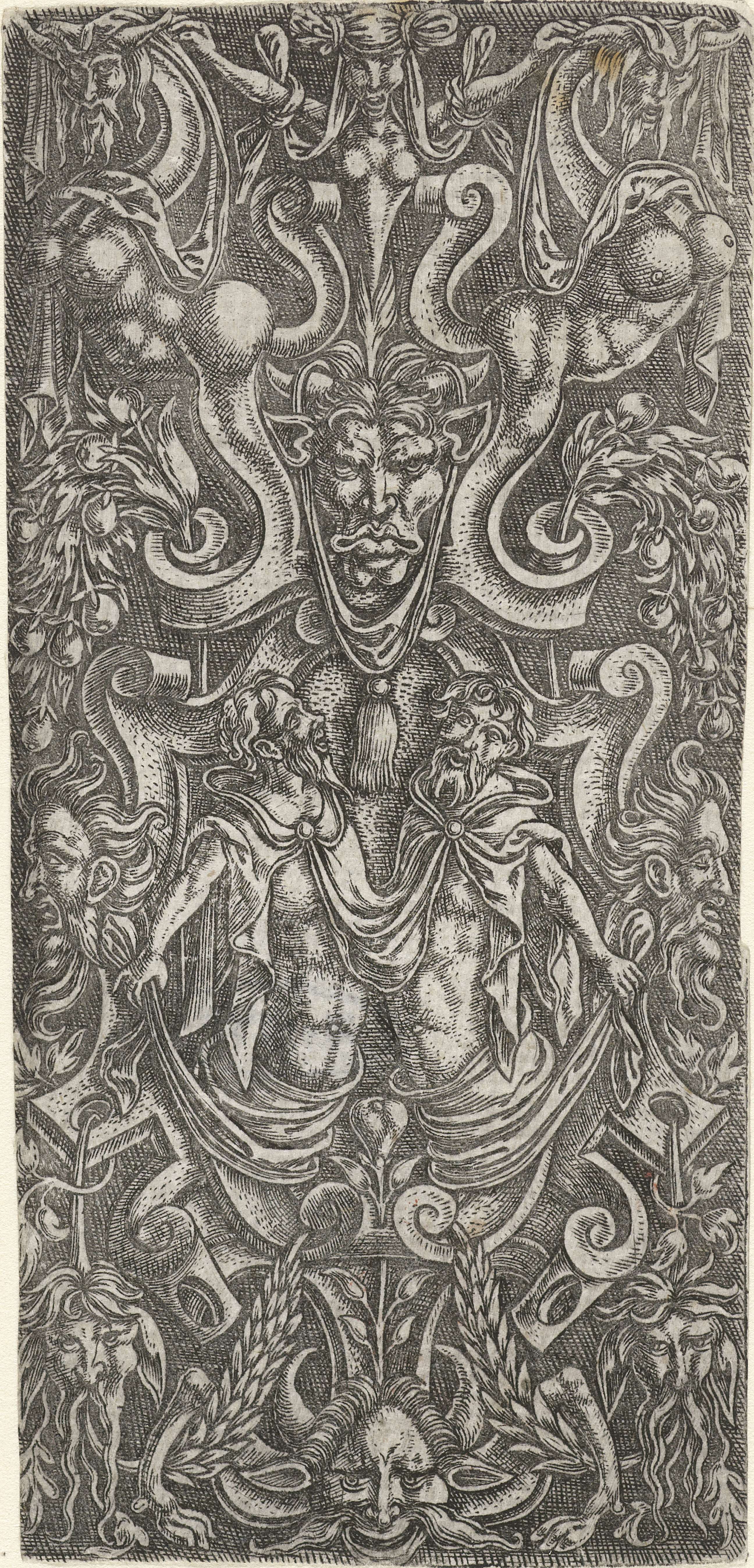 De mannen zijn door hun aaneen geknoopte mantels met elkaar verbonden. Boven hen hangt een mascaron. Gearceerde achtergrond. Eén van 4 bladen.
