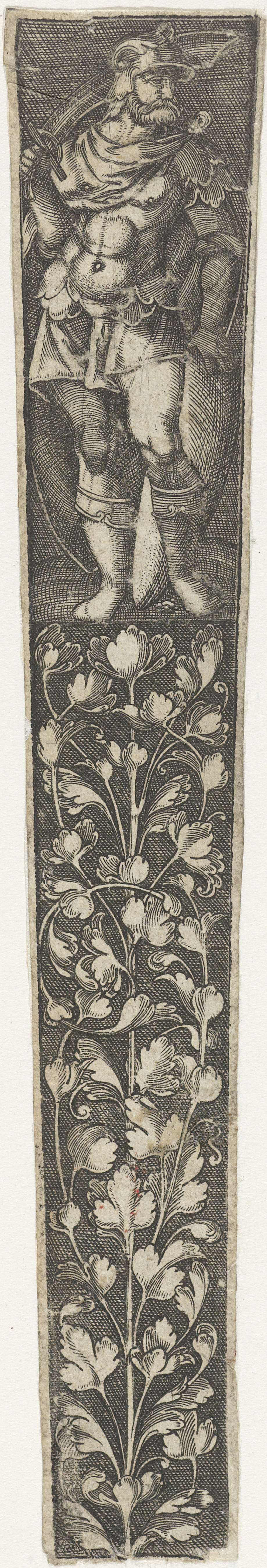Krijgsman met een schild en een zwaard over zijn schouder. Het onderste gedeelte is gedecoreerd met bladranken. Gearceerde achtergrond. Tegenzijdige kopie naar het bovenste gedeelte van een prent van Monogrammist IB (zie Orn Cat I-401).