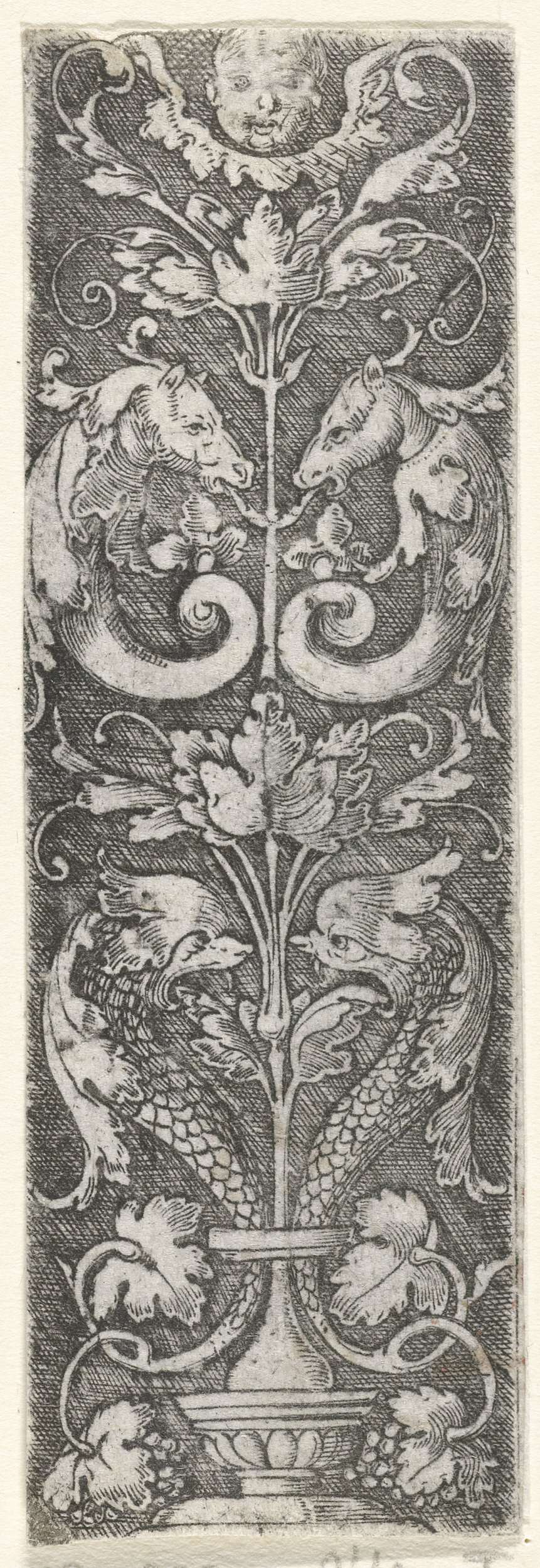 Bekroond door een cherubijntje en geflankeerd door twee paardenhoofden en twee vissen. Gearceerde achtergrond.