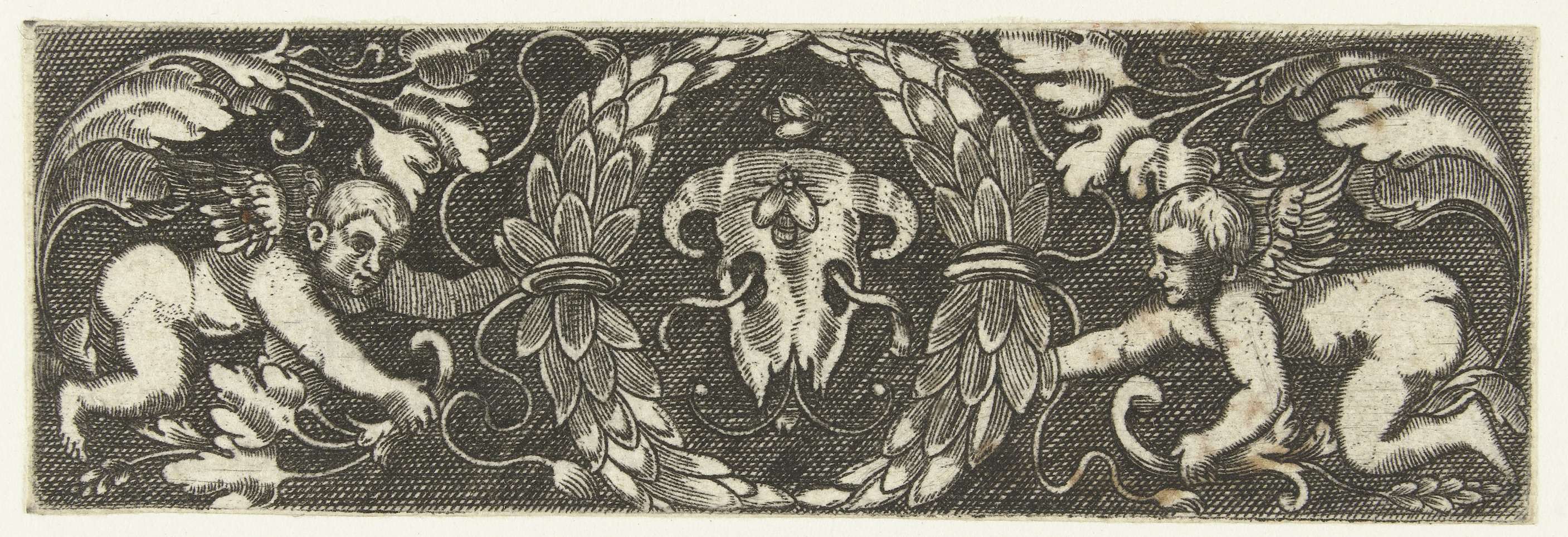 Twee putti houden een lauwerkrans rond de schedel vast.