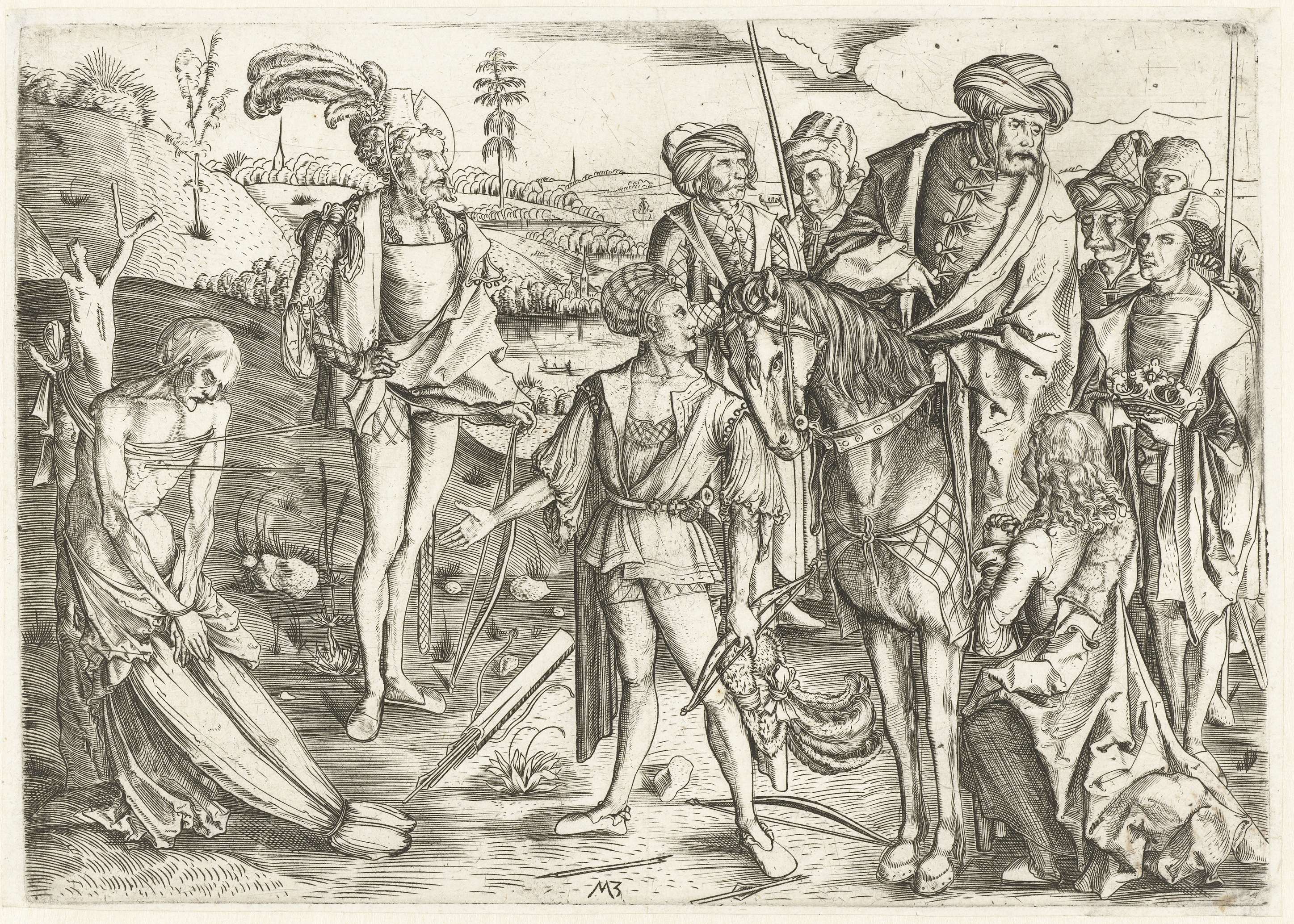Een jongeman knielt voor een ruiter. Naast hem staat een man met een kroon in handen. Aan de andere zijde van de ruiter staan twee andere jongemannen met bogen in de handen. Een van hen wijst op het dode lichaam van een oude man, gebonden aan een boomstronk, het hart doorboord met twee pijlen. Deze ...