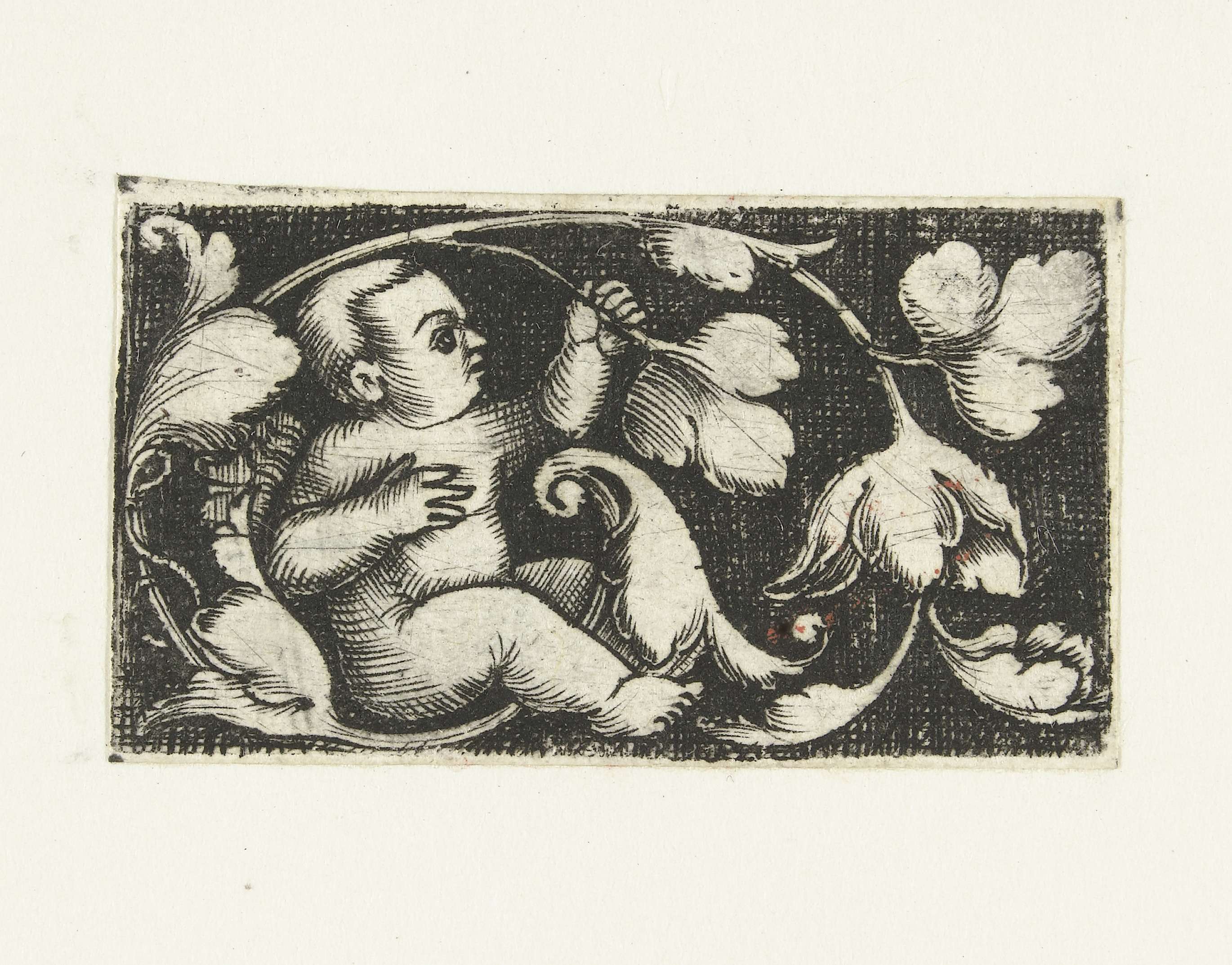 Het kind zit tegen en onder een bladrank. Gearceerde achtergrond.