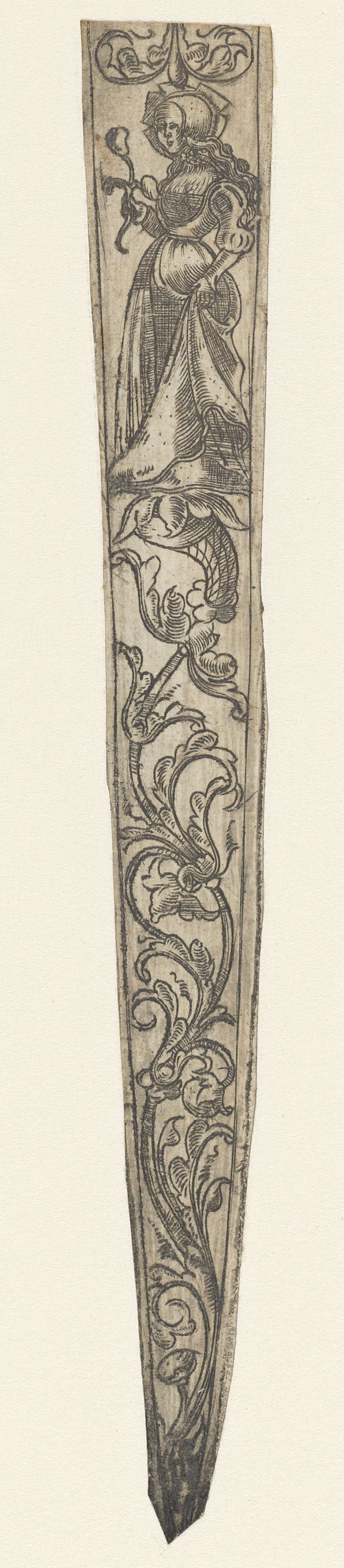 Het onderste gedeelte is gedecoreerd met een slingerende bladrank. Daarboven staat een vrouw met een bloem in haar hand.