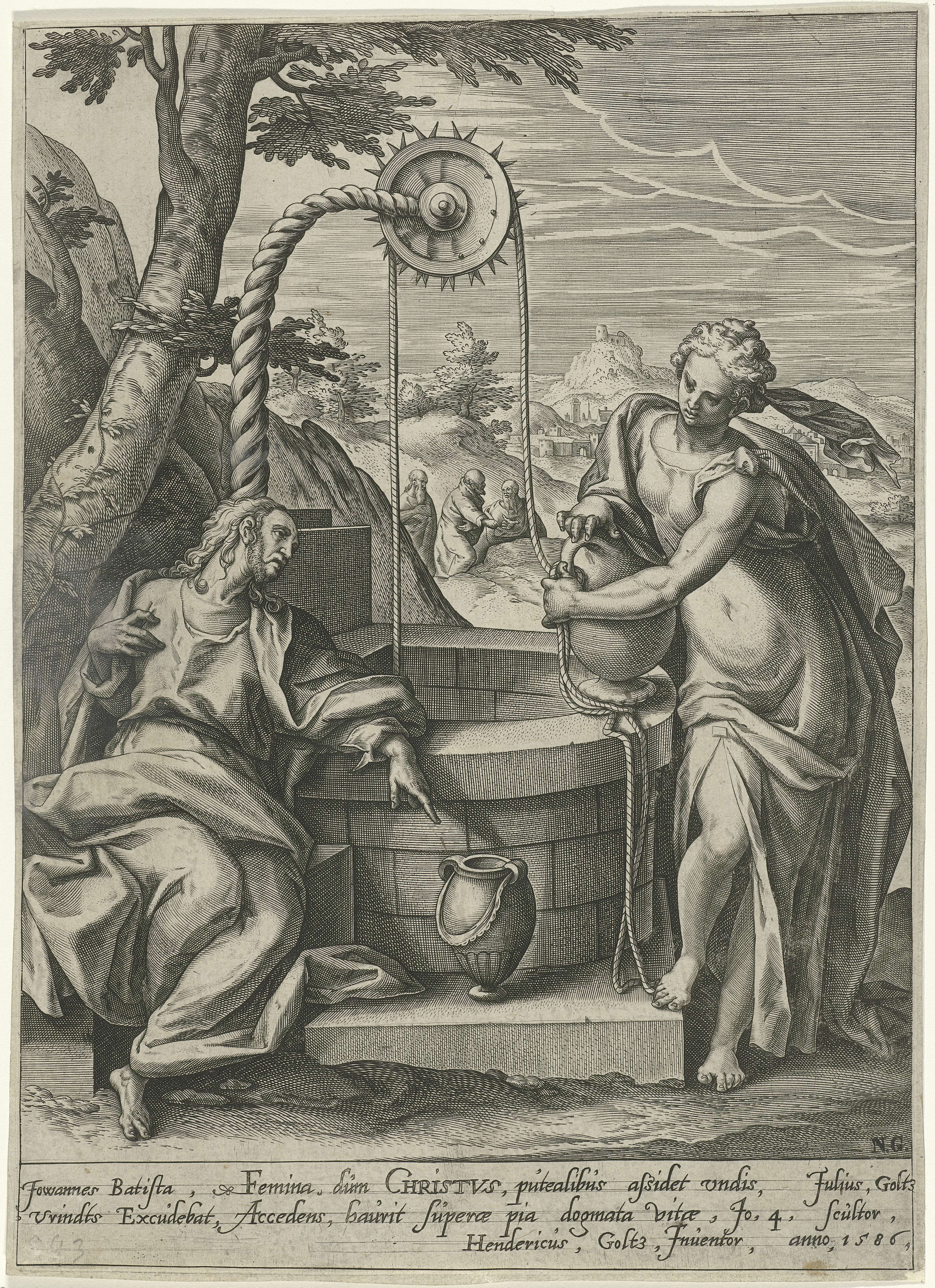 Christus zit op de grond bij een bron en is in gesprek met een Samaritaanse vrouw. Hij vraagt haar om wat water uit haar kruik. De apostelen in de achtergrond (Johannes 4:1-30). De prent heeft een Latijns onderschrift.
