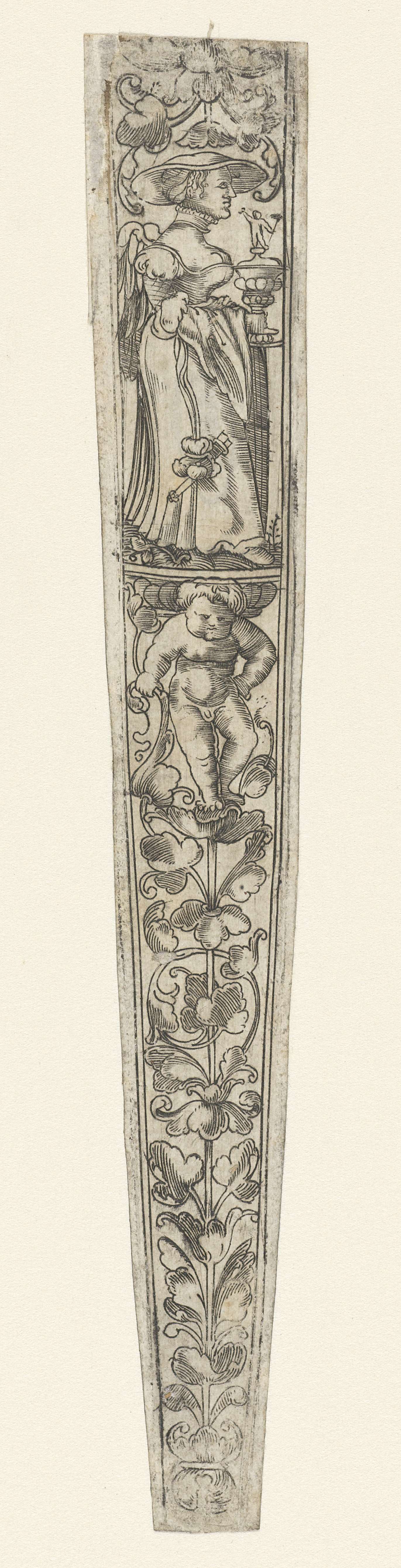 De vrouw draagt een grote hoed en heeft een vaas in haar hand. Het onderste gedeelte is gedecoreerd met bladranken waarop een jongetje staat.