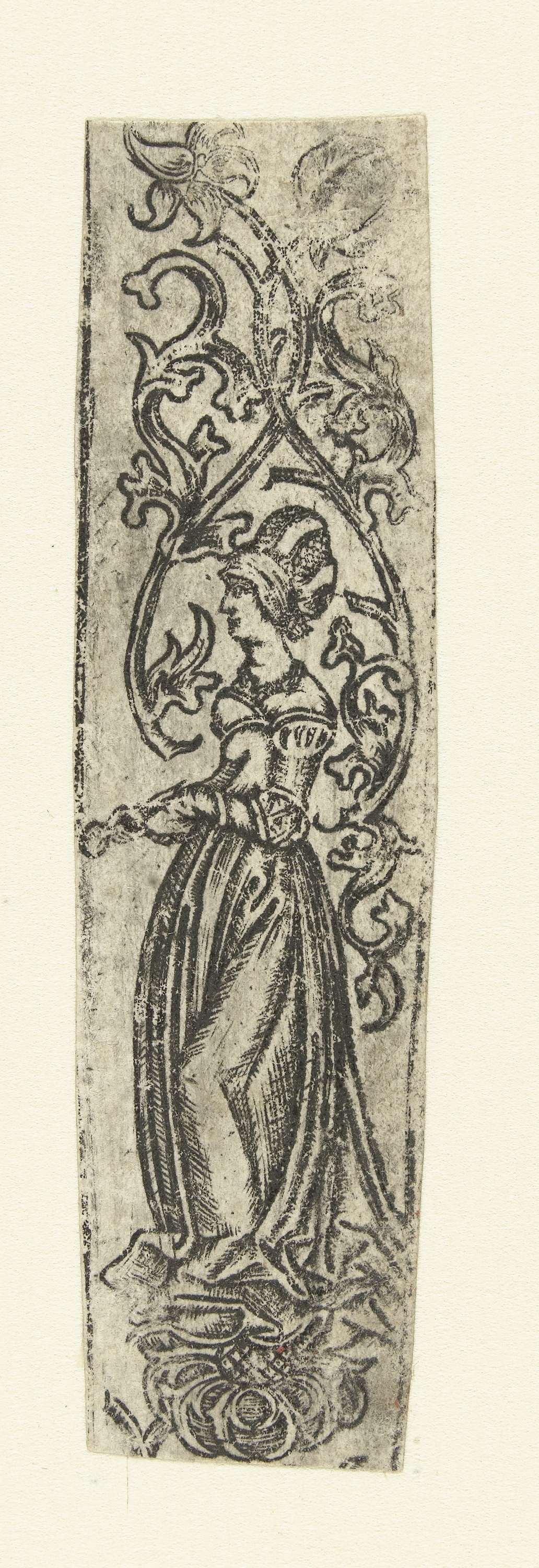Messenheft, gedecoreerd met een vrouw met een tang in haar handen (St. Agatha?)