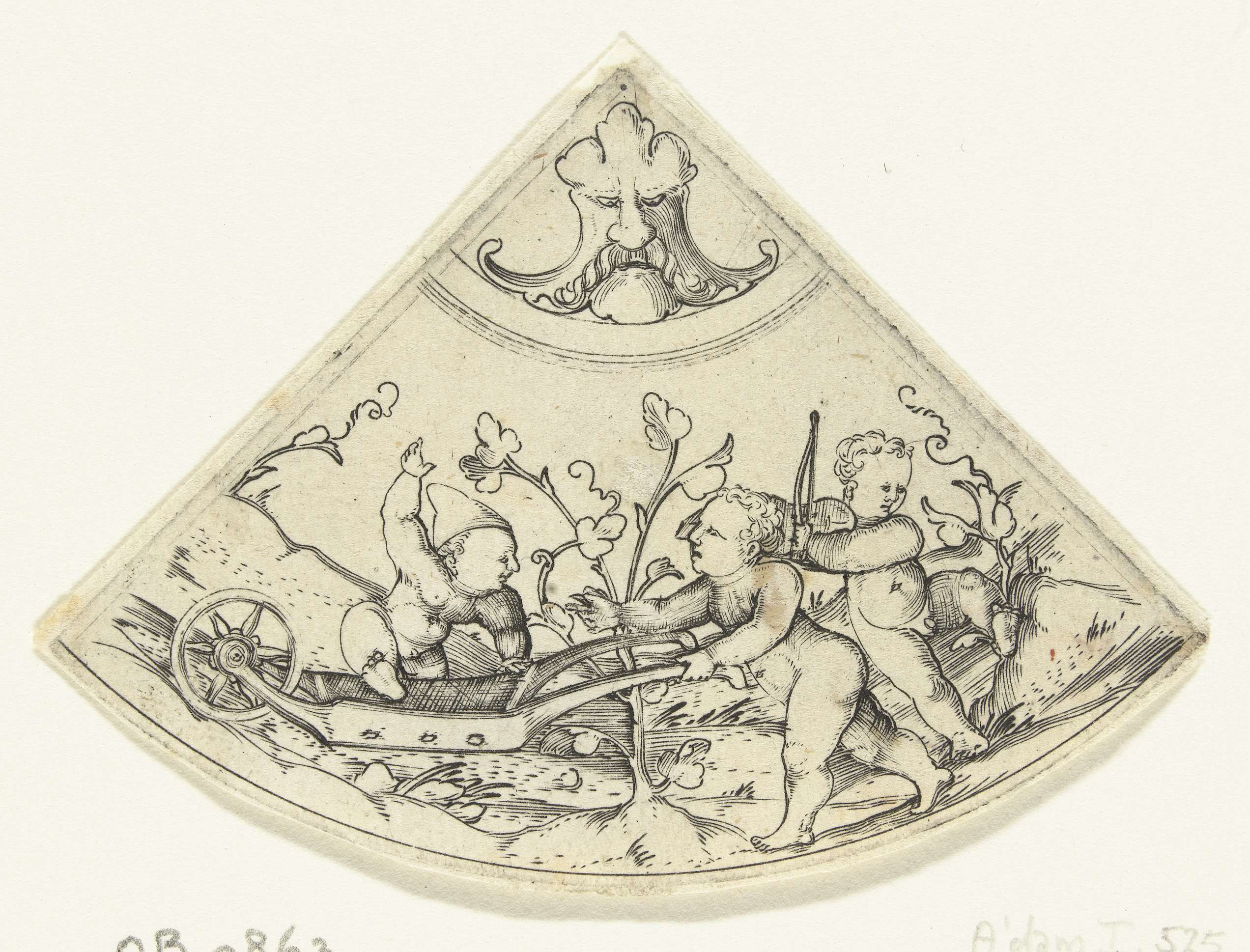 Kwart segment van een cirkel met in de punt een mascaron