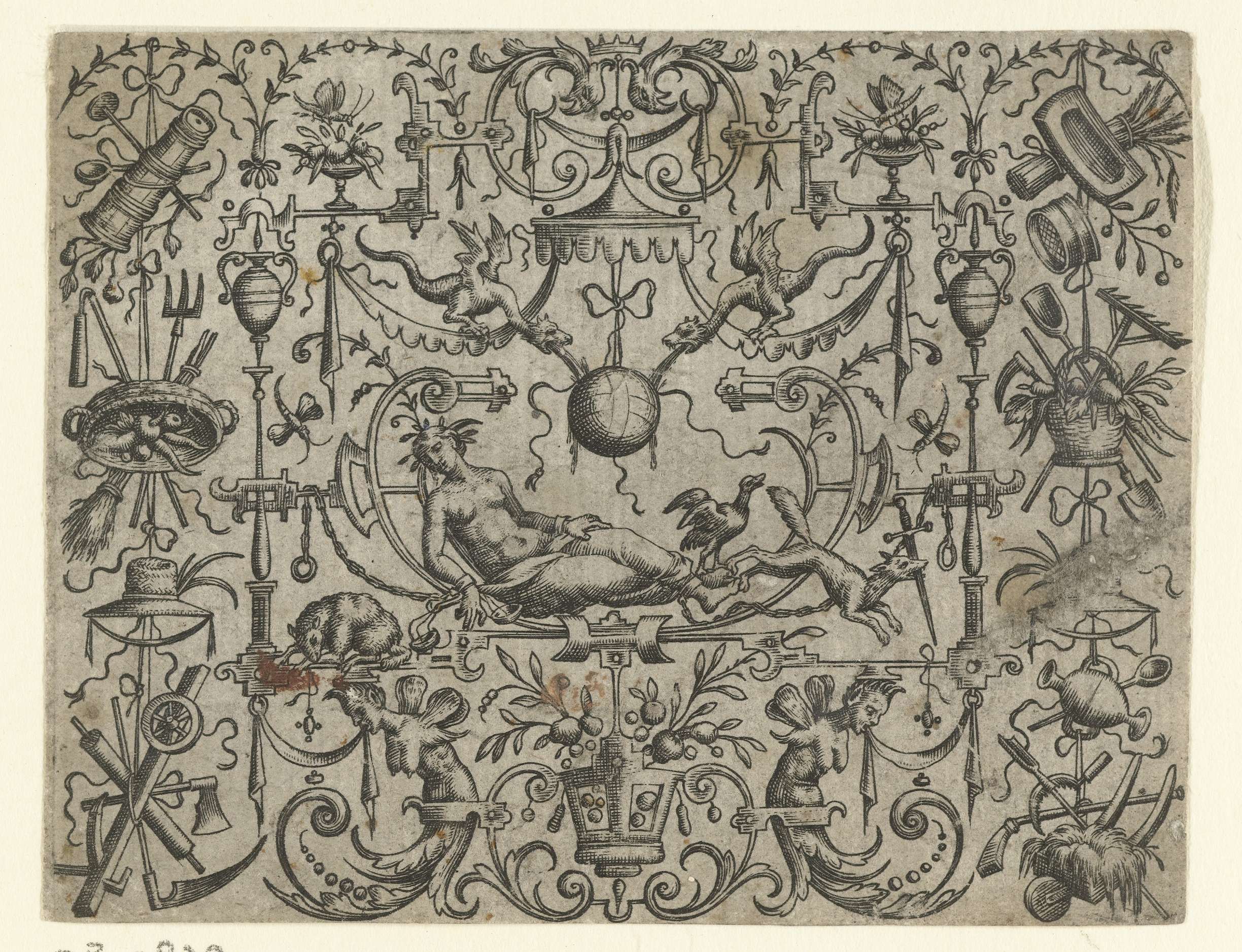 In het midden ligt Ceres vastgeketend, geflankeerd door trofeën met landbouwwerktuigen. Tegenzijdige kopie naar een prent uit de eerste editie.