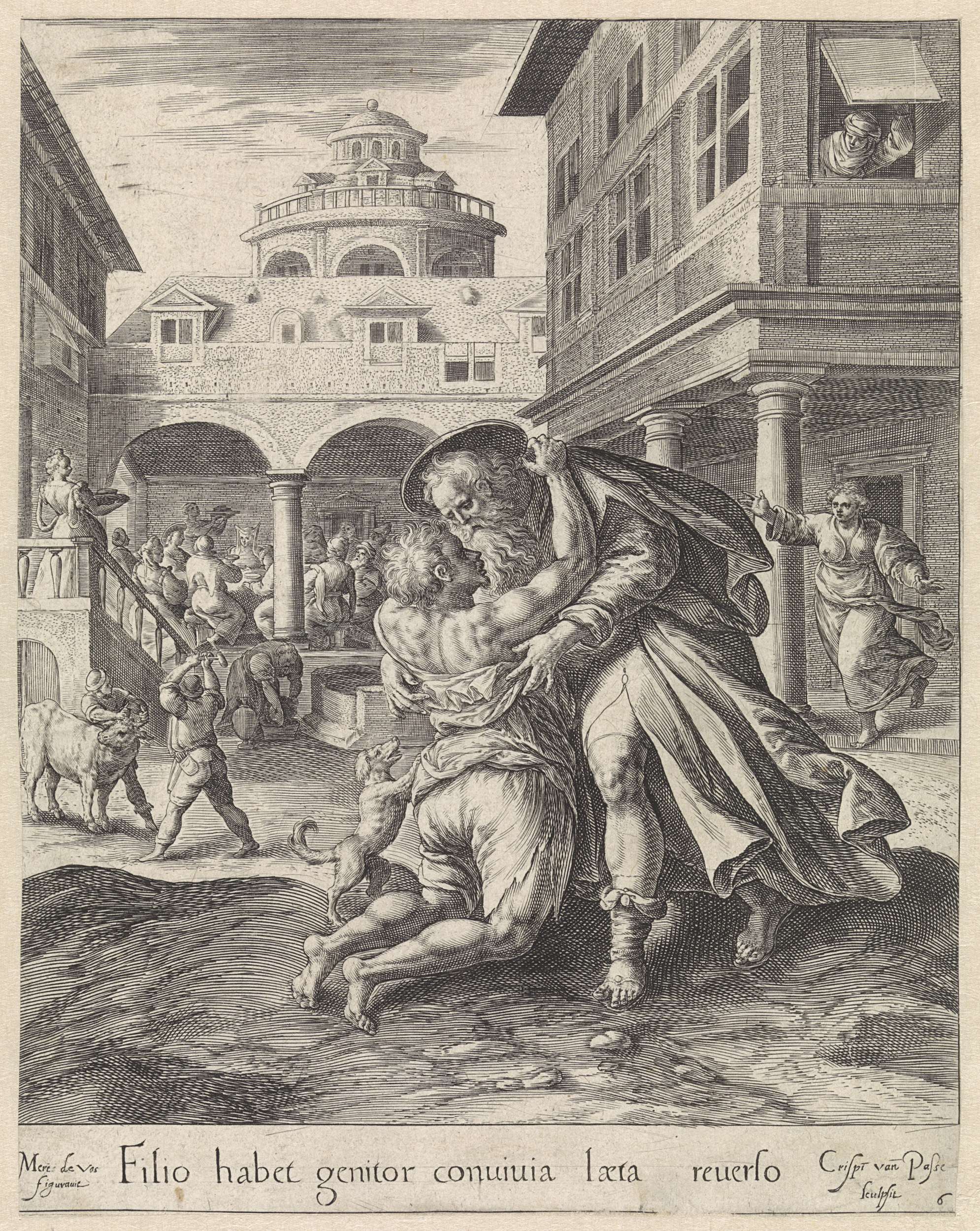 De verloren zoon keert terug naar huis. Hij wordt daar opgewacht door zijn vader, die hem hartelijk verwelkomt. Hij laat een kalf slachten voor een feestmaal om de terugkeer van zijn zoon te vieren. In de marge een onderschrift in het Latijn.