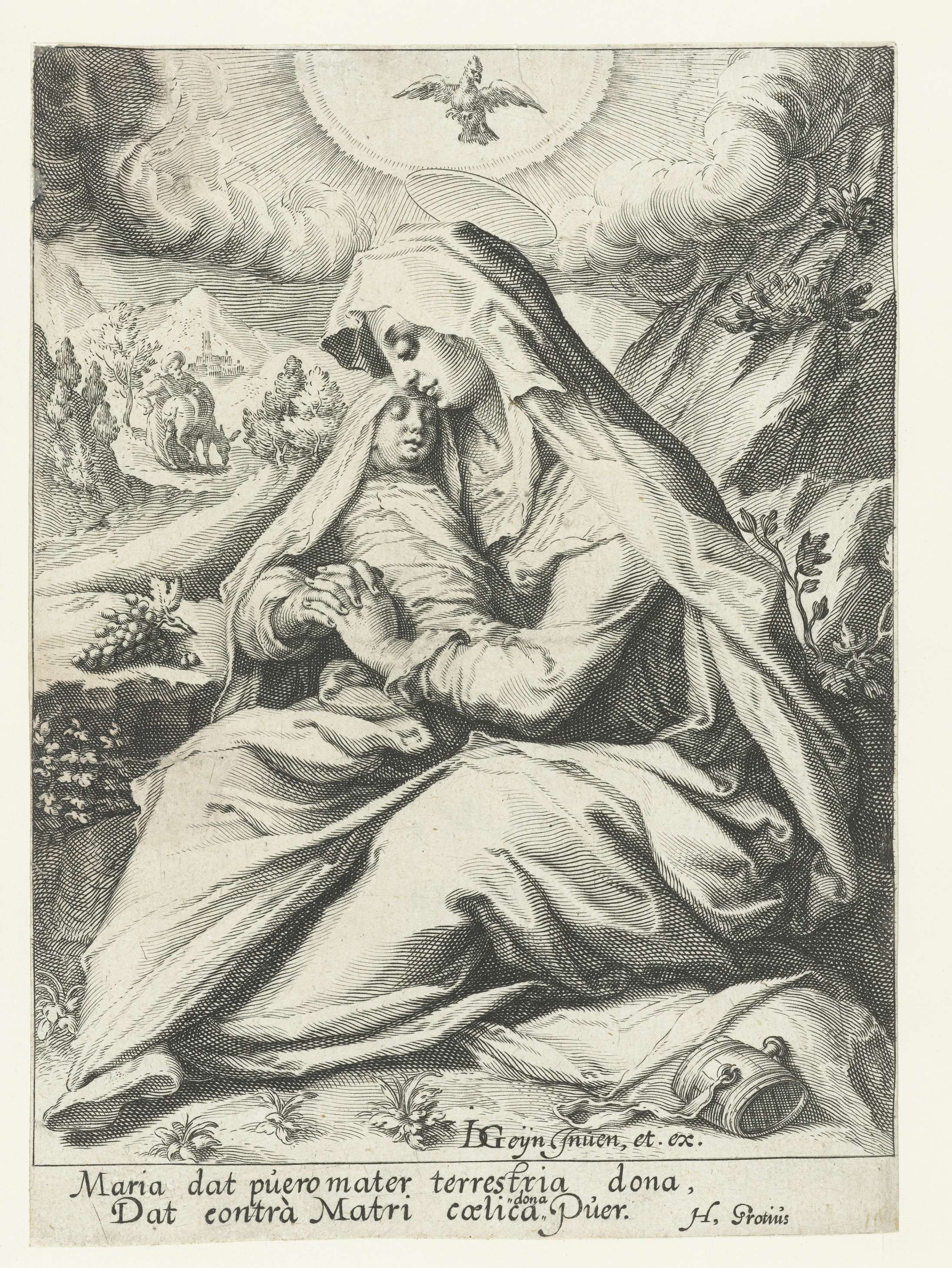 Maria zit met het Christuskind op schoot in een bergachtige omgeving. Een duif prijkt in stralenkrans boven haar hoofd. Op de achtergrond staat Jozef bij een ezel. Onder de voorstelling een tweeregelige Latijnse tekst.